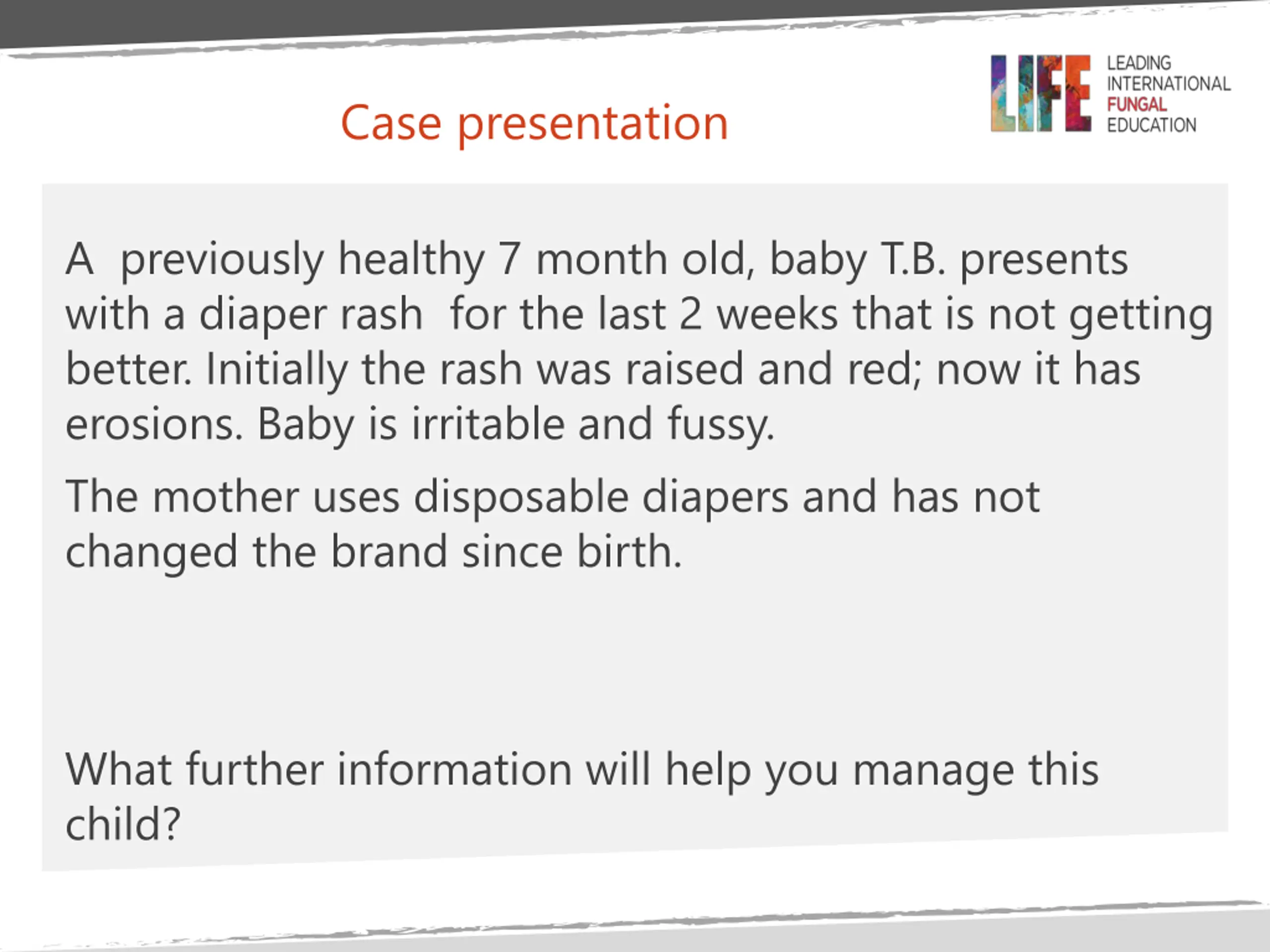 Case presentation A previously healthy 7 month old, baby T.B. presents with a diaper rash for the last 2 weeks that is not getting better. Initially the rash was raised and red; now it has erosions. Baby is irritable and fussy. The mother uses disposable diapers and has not changed the brand since birth. What further information will help you manage this child?