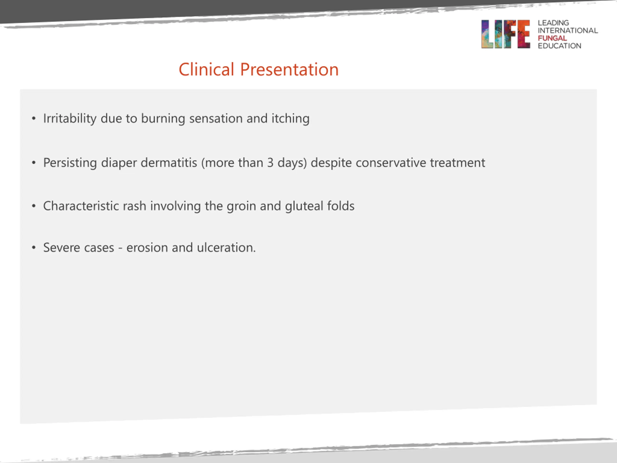 Clinical Presentation Irritability due to burning sensation and itching Persisting diaper dermatitis (more than 3 days) despite conservative treatment Characteristic rash involving the groin and gluteal folds Severe cases - erosion and ulceration.