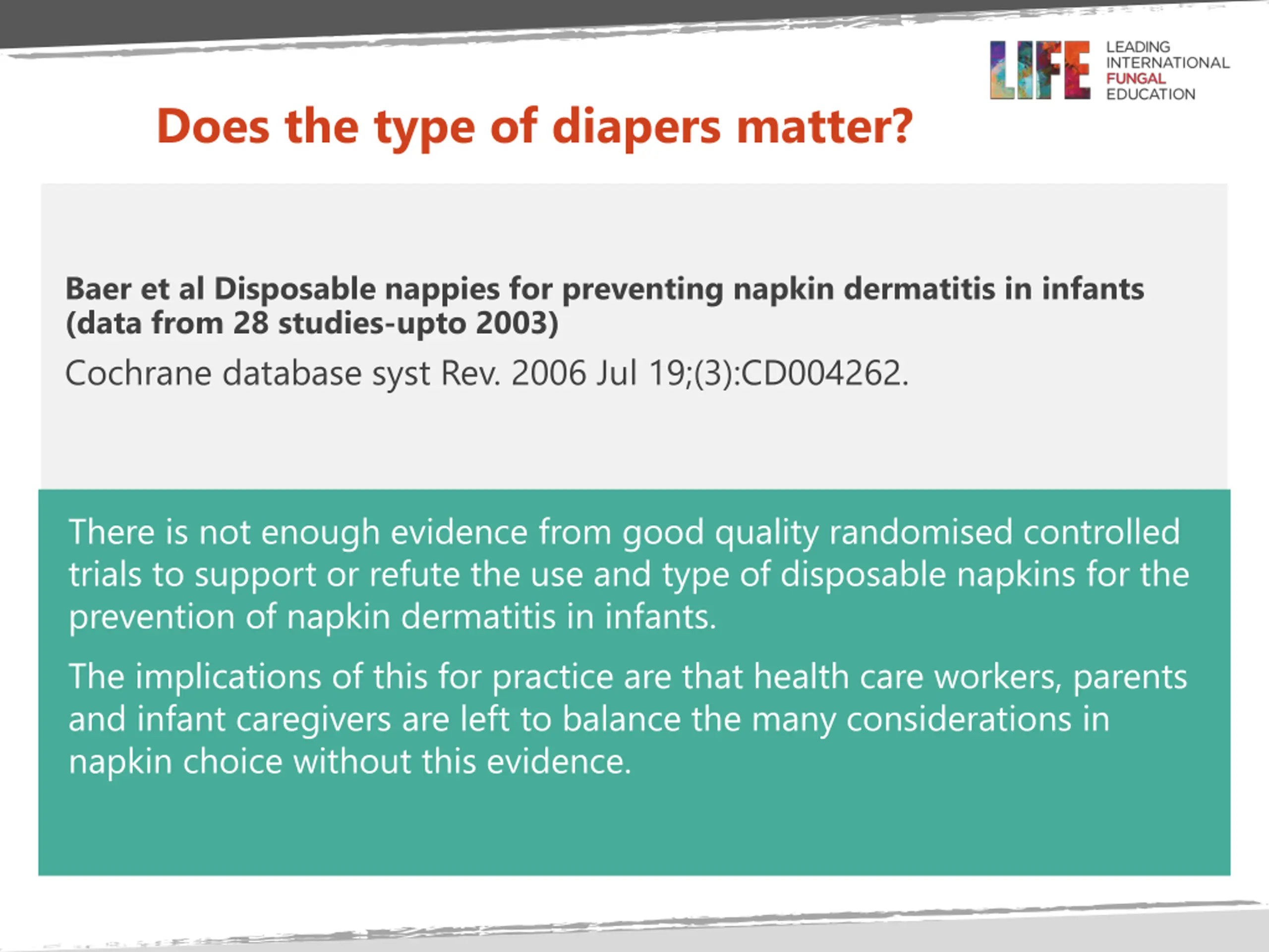 Does the type of diapers matter? Baer et al Disposable nappies for preventing napkin dermatitis in infants (data from 28 studies-upto 2003) Cochrane database syst Rev. 2006 Jul 19;(3):CD004262. There is not enough evidence from good quality randomised controlled trials to support or refute the use and type of disposable napkins for the prevention of napkin dermatitis in infants. The implications of this for practice are that health care workers, parents and infant caregivers are left to balance the many considerations in napkin choice without this evidence.