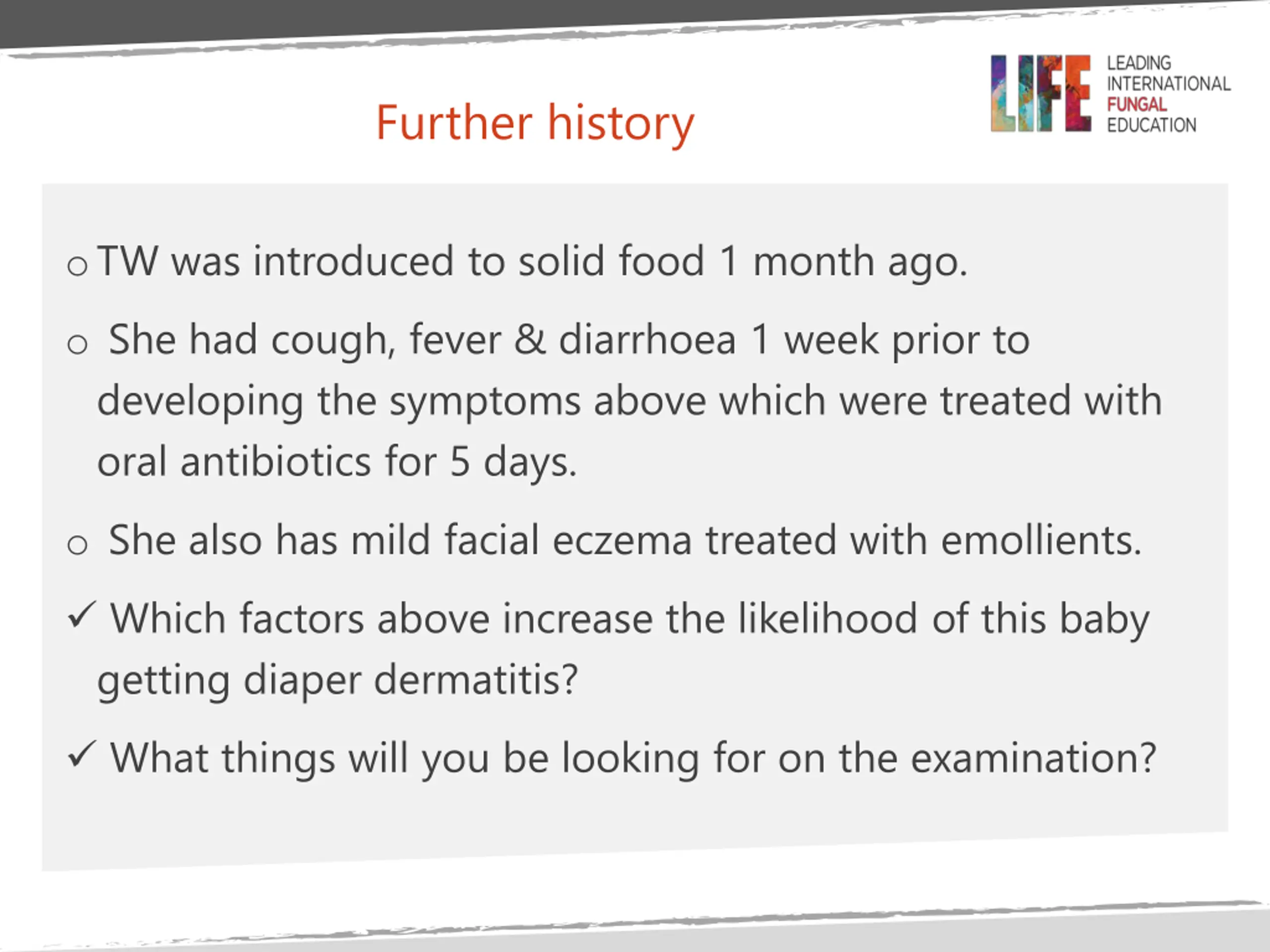 Further history oTW was introduced to solid food 1 month ago. o She had cough, fever & diarrhoea 1 week prior to developing the symptoms above which were treated with oral antibiotics for 5 days. o She also has mild facial eczema treated with emollients. Which factors above increase the likelihood of this baby getting diaper dermatitis? What things will you be looking for on the examination?