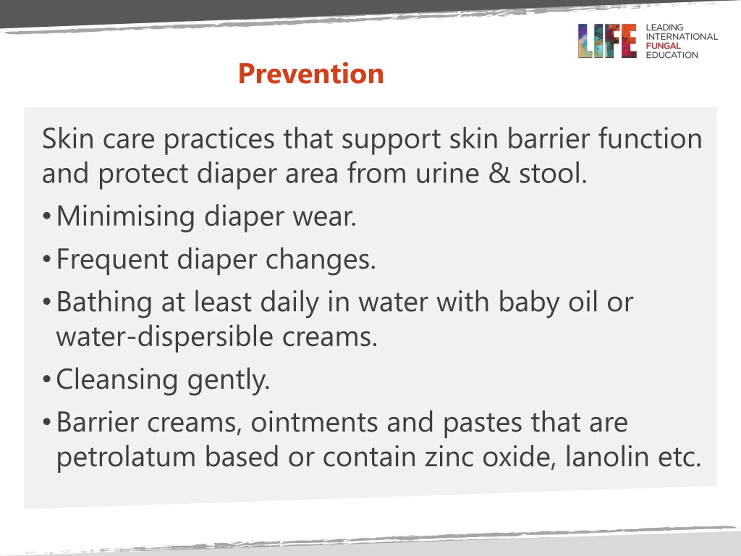 Prevention Skin care practices that support skin barrier function and protect diaper area from urine & stool. Minimising diaper wear. Frequent diaper changes. Bathing at least daily in water with baby oil or water-dispersible creams. Cleansing gently. Barrier creams, ointments and pastes that are petrolatum based or contain zinc oxide, lanolin etc.