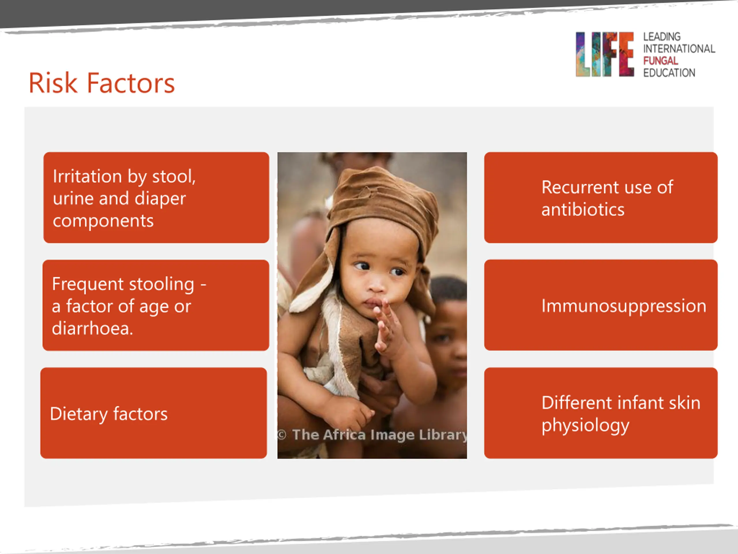Risk Factors Irritation by stool, urine and diaper components Recurrent use of antibiotics Frequent stooling - a factor of age or diarrhoea. Immunosuppression Different infant skin physiology Dietary factors
