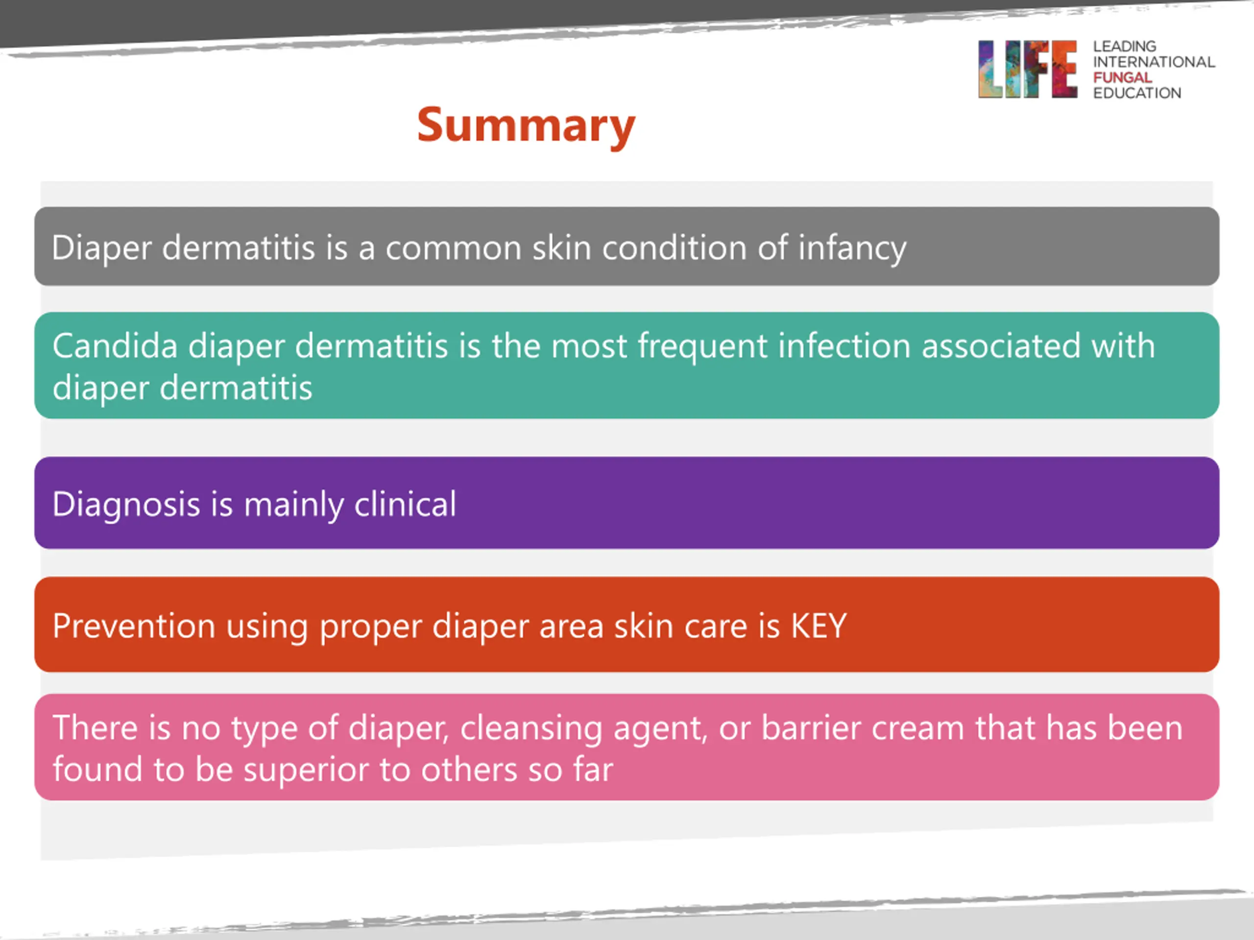 Summary Diaper dermatitis is a common skin condition of infancy Candida diaper dermatitis is the most frequent infection associated with diaper dermatitis Diagnosis is mainly clinical Prevention using proper diaper area skin care is KEY There is no type of diaper, cleansing agent, or barrier cream that has been found to be superior to others so far