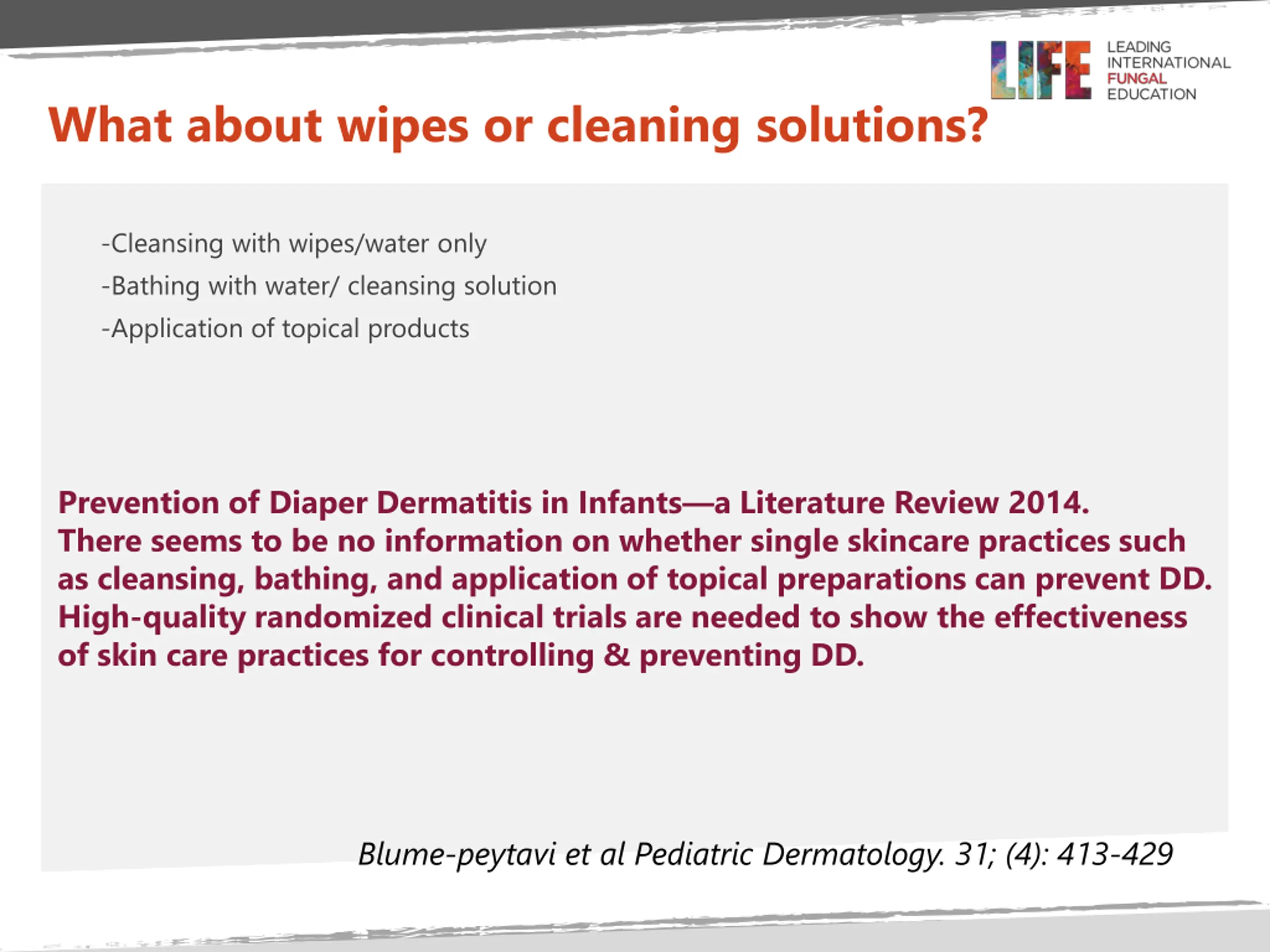 What about wipes or cleaning solutions? -Cleansing with wipes/water only -Bathing with water/ cleansing solution -Application of topical products Prevention of Diaper Dermatitis in Infants a Literature Review 2014. There seems to be no information on whether single skincare practices such as cleansing, bathing, and application of topical preparations can prevent DD. High-quality randomized clinical trials are needed to show the effectiveness of skin care practices for controlling & preventing DD. Blume-peytavi et al Pediatric Dermatology. 31; (4): 413-429