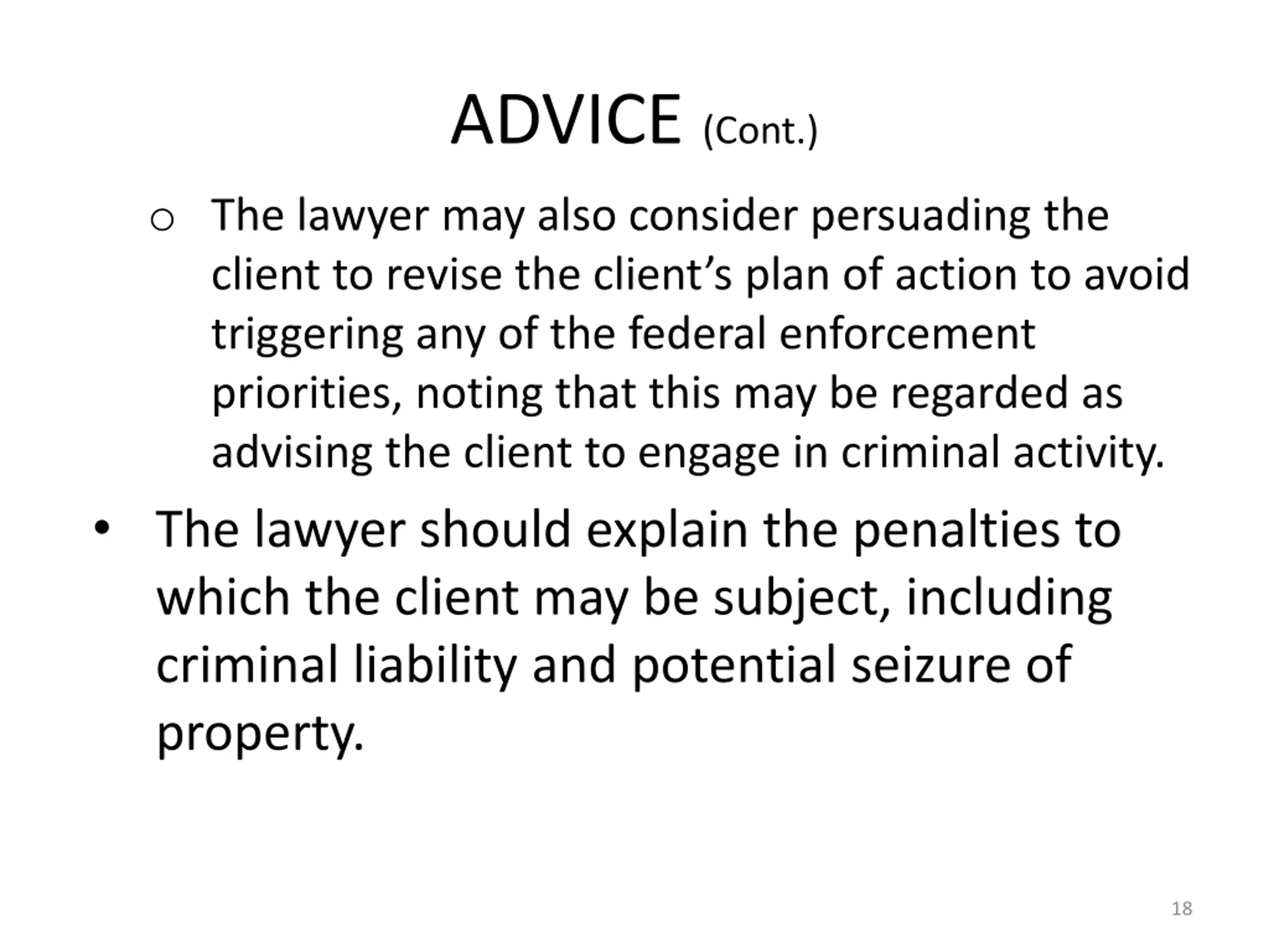 ADVICE (Cont.) o The lawyer may also consider persuading the client to revise the client s plan of action to avoid triggering any of the federal enforcement priorities, noting that this may be regarded as advising the client to engage in criminal activity. The lawyer should explain the penalties to which the client may be subject, including criminal liability and potential seizure of property. 18