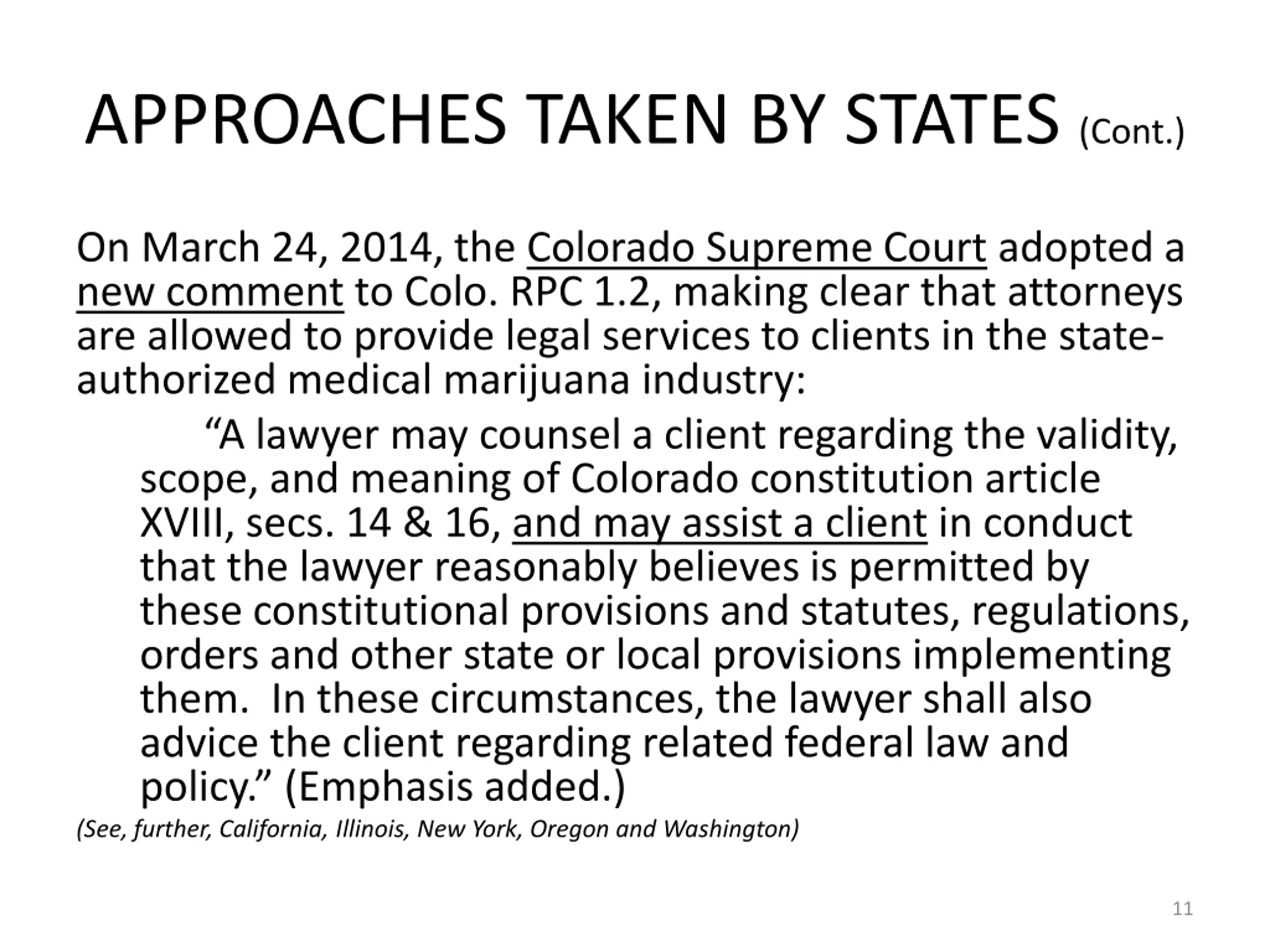 APPROACHES TAKEN BY STATES (Cont.) 2. Colorado (prior to March 2014). A lawyer does not violate Colo. RPC 1.2(d) by representing a client in proceedings relating to the client s past activities; by advising governmental clients regarding the creation of rules and regulations implementing the Medical Marijuana Code; by arguing or lobbying for certain regulations, rules, or standards; or by advising clients regarding the consequences of marijuana use or commerce under Colorado or federal law for good or ill, under the plain language of Colo. RPC 1.2(d), it is unethical for a lawyer to counsel a client to engage, or assist a client, in conduct that violates federal law. Between these two points lies a range of conduct in which the application of Colo. RPC 1.2(d) is unclear. 10
