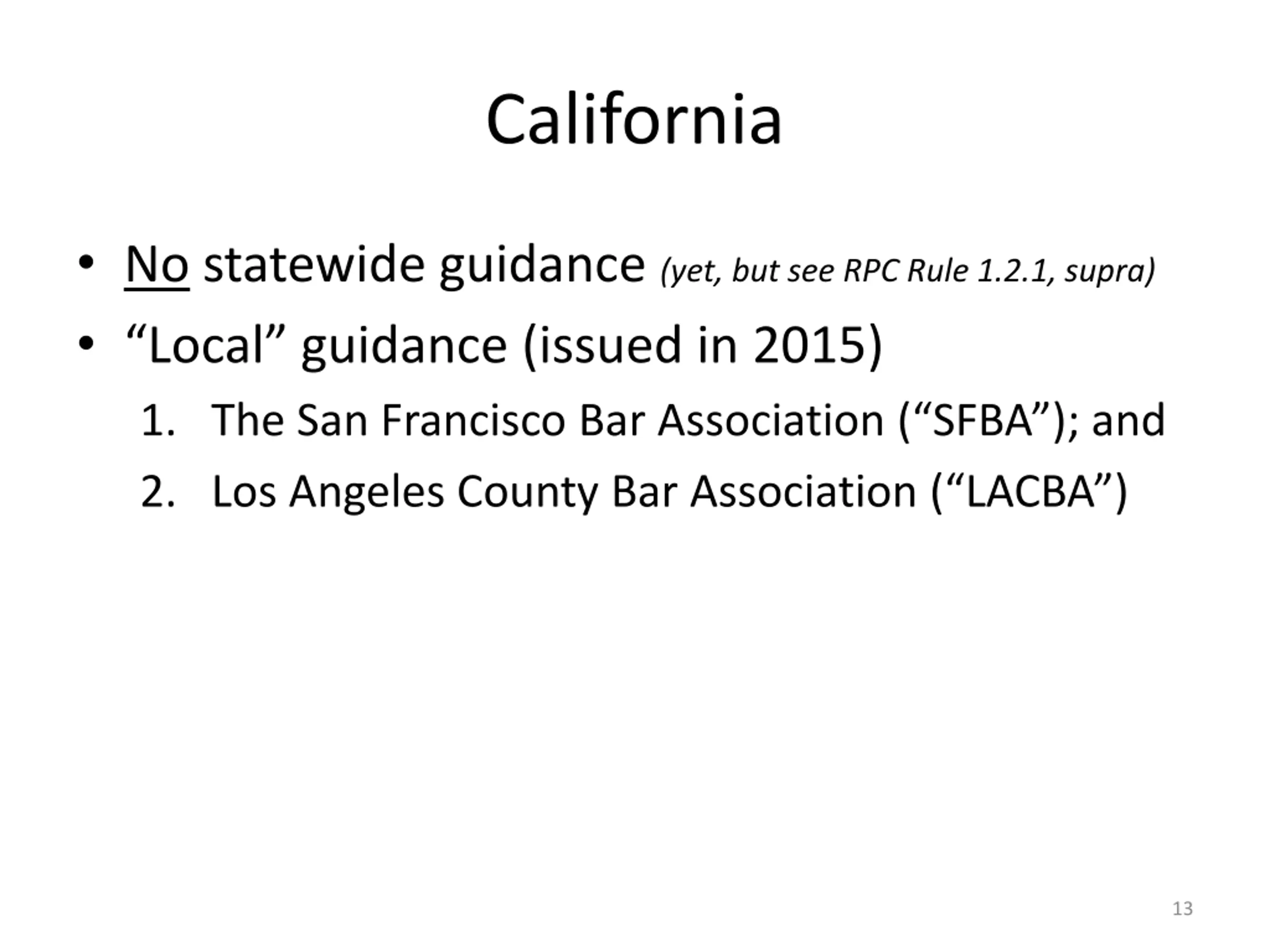 California No statewide guidance (yet, but see RPC Rule 1.2.1, supra) Local guidance (issued in 2015) 1. The San Francisco Bar Association ( SFBA ); and 2. Los Angeles County Bar Association ( LACBA ) 13