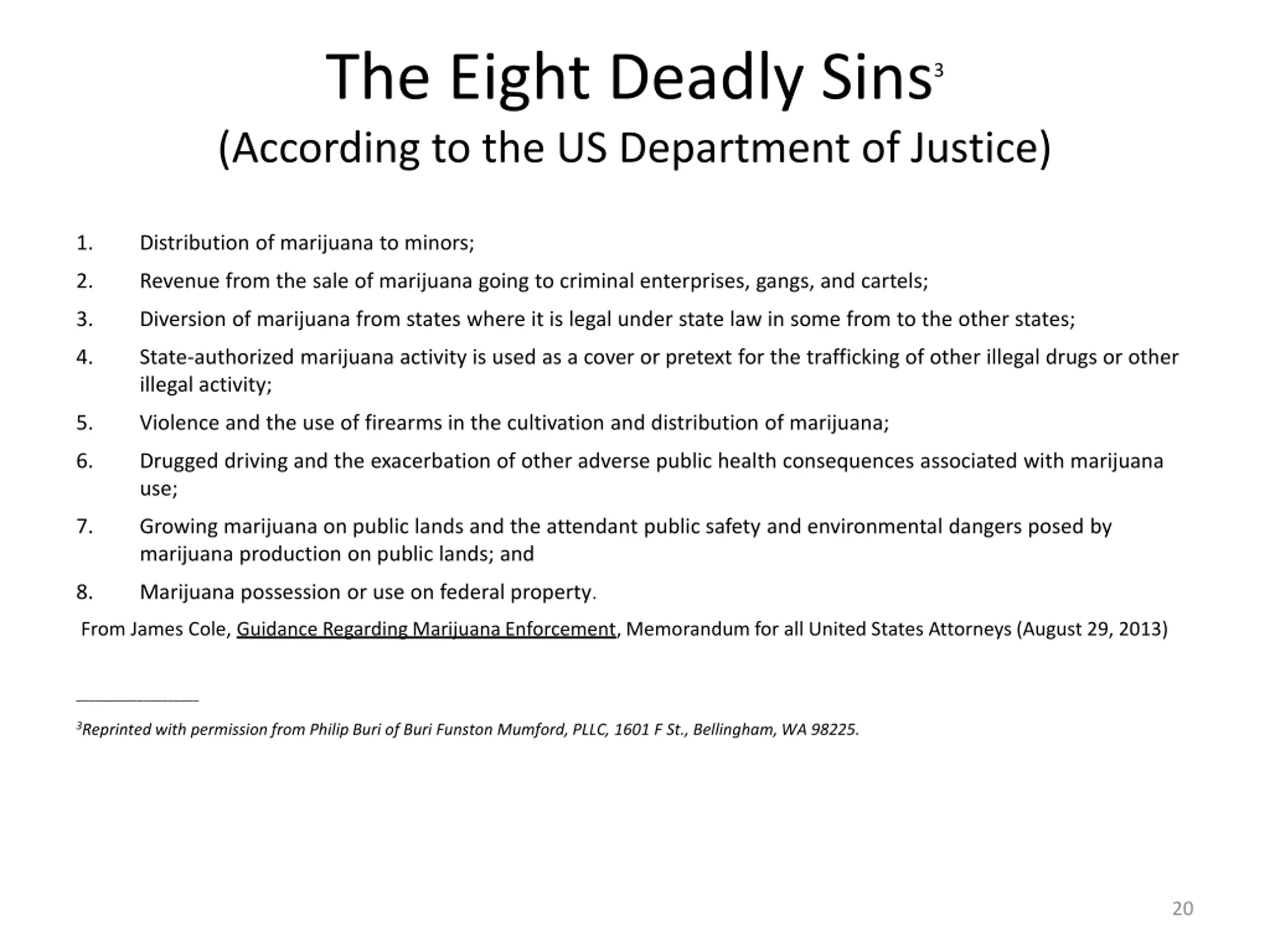 The Eight Deadly Sins (According to the US Department of Justice) 3 1. Distribution of marijuana to minors; 2. Revenue from the sale of marijuana going to criminal enterprises, gangs, and cartels; 3. Diversion of marijuana from states where it is legal under state law in some from to the other states; 4. State-authorized marijuana activity is used as a cover or pretext for the trafficking of other illegal drugs or other illegal activity; 5. Violence and the use of firearms in the cultivation and distribution of marijuana; 6. Drugged driving and the exacerbation of other adverse public health consequences associated with marijuana use; 7. Growing marijuana on public lands and the attendant public safety and environmental dangers posed by marijuana production on public lands; and 8. Marijuana possession or use on federal property. From James Cole, Guidance Regarding Marijuana Enforcement, Memorandum for all United States Attorneys (August 29, 2013) ____________________ 3Reprinted with permission from Philip Buri of Buri Funston Mumford, PLLC, 1601 F St., Bellingham, WA 98225. 20