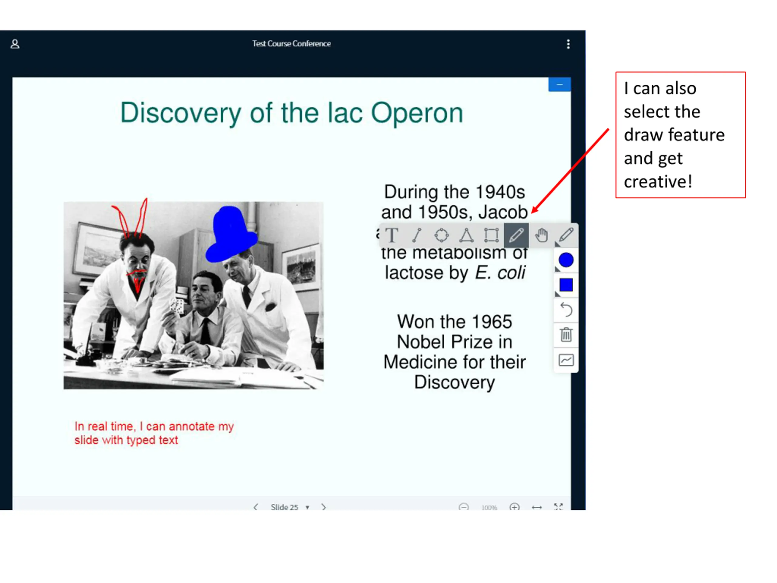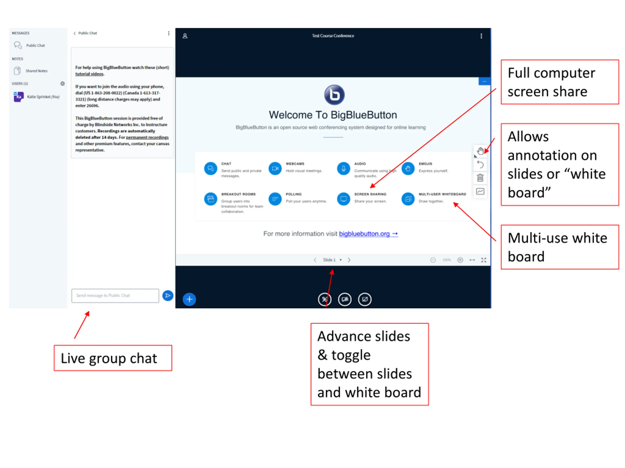 Full computer screen share Allows annotation on slides or white board Multi-use white board Advance slides & toggle between slides and white board Live group chat