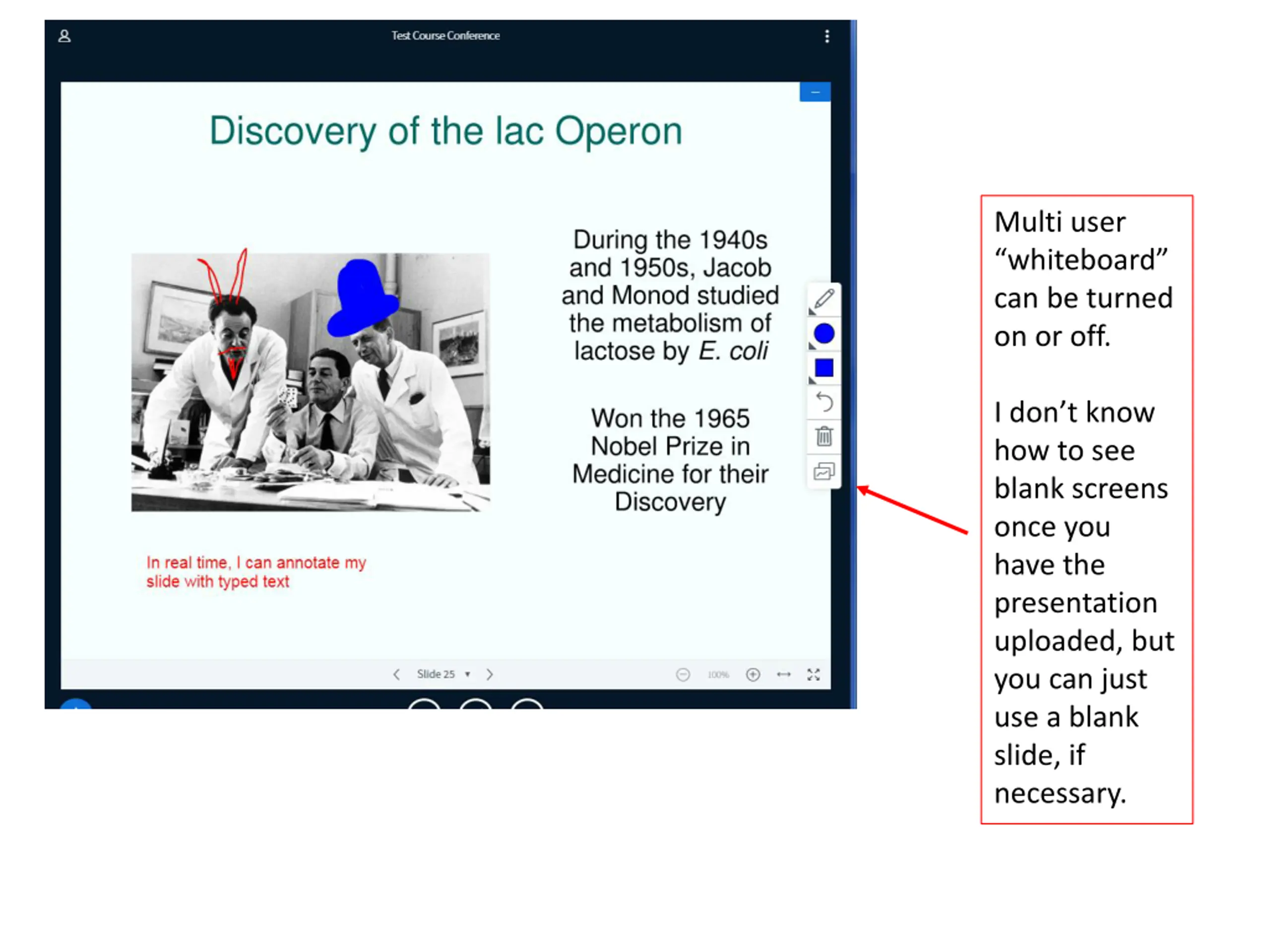 Multi user whiteboard can be turned on or off. I don t know how to see blank screens once you have the presentation uploaded, but you can just use a blank slide, if necessary.