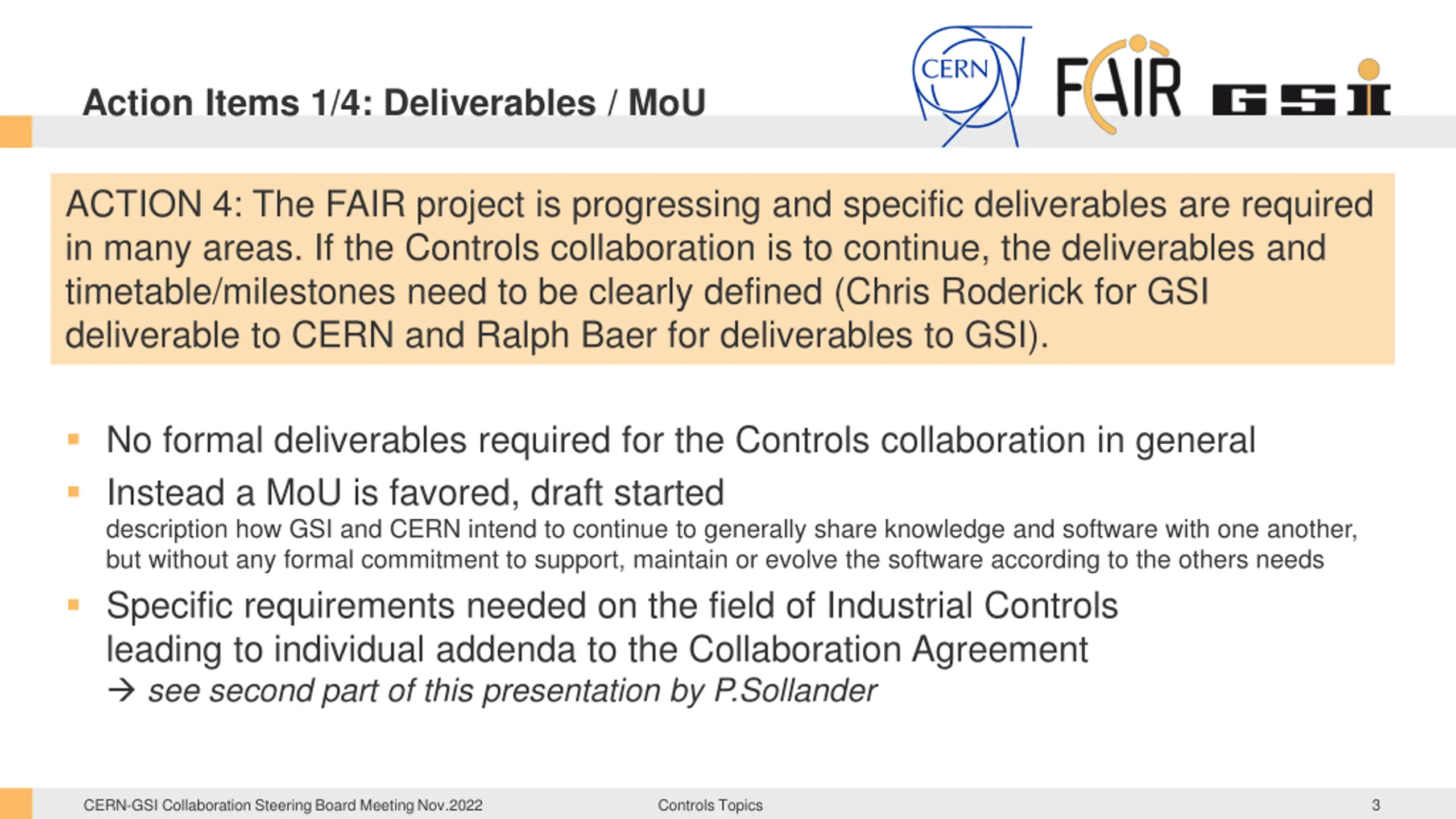Action Items 1/4: Deliverables / MoU ACTION 4: The FAIR project is progressing and specific deliverables are required in many areas. If the Controls collaboration is to continue, the deliverables and timetable/milestones need to be clearly defined (Chris Roderick for GSI deliverable to CERN and Ralph Baer for deliverables to GSI). No formal deliverables required for the Controls collaboration in general Instead a MoU is favored, draft started description how GSI and CERN intend to continue to generally share knowledge and software with one another, but without any formal commitment to support, maintain or evolve the software according to the others needs Specific requirements needed on the field of Industrial Controls leading to individual addenda to the Collaboration Agreement see second part of this presentation by P.Sollander 3 CERN-GSI Collaboration Steering Board Meeting Nov.2022 Controls Topics