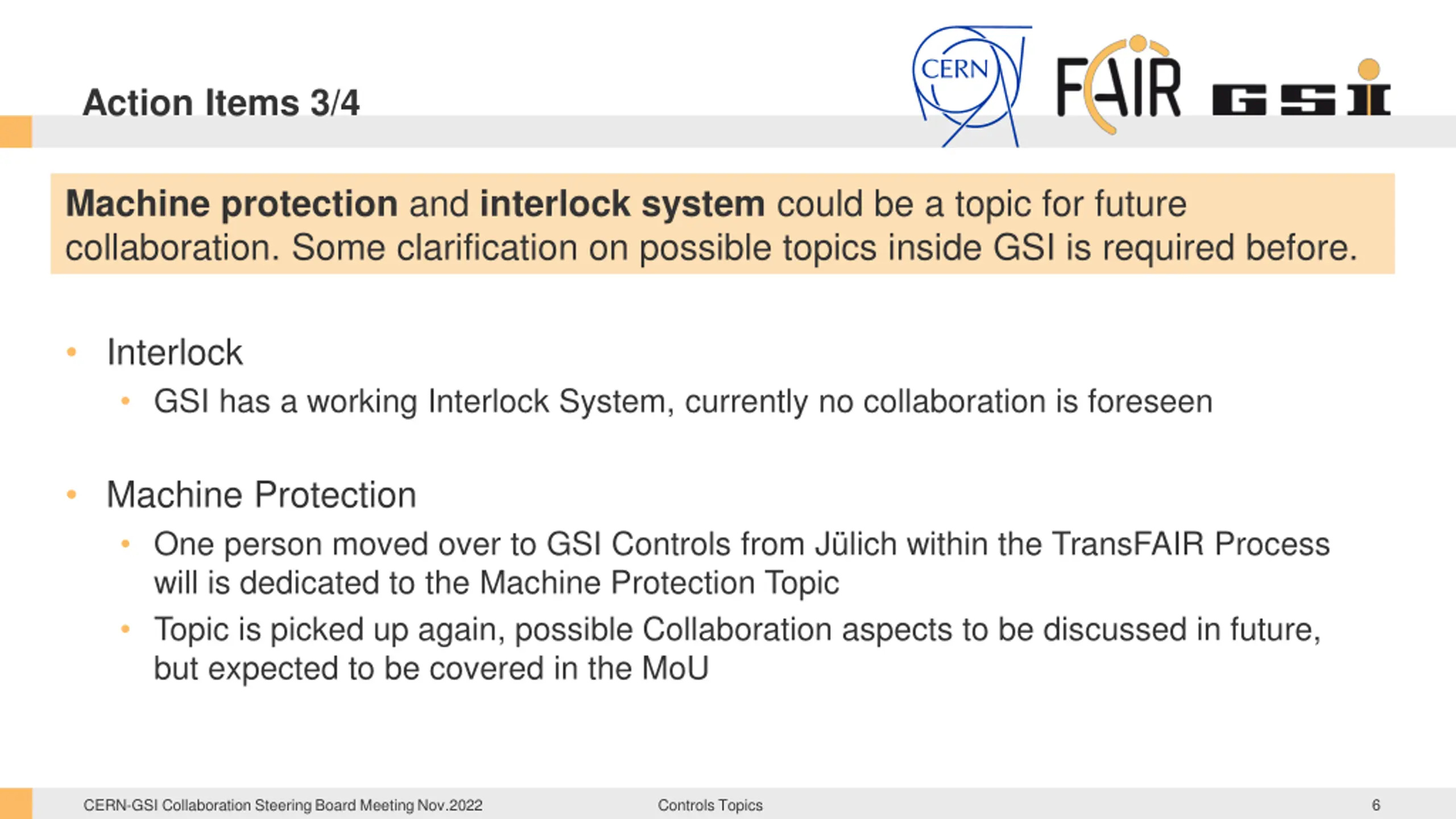 Action Items 3/4 Machine protection and interlock system could be a topic for future collaboration. Some clarification on possible topics inside GSI is required before. Interlock GSI has a working Interlock System, currently no collaboration is foreseen Machine Protection One person moved over to GSI Controls from J lich within the TransFAIR Process will is dedicated to the Machine Protection Topic Topic is picked up again, possible Collaboration aspects to be discussed in future, but expected to be covered in the MoU 6 CERN-GSI Collaboration Steering Board Meeting Nov.2022 Controls Topics