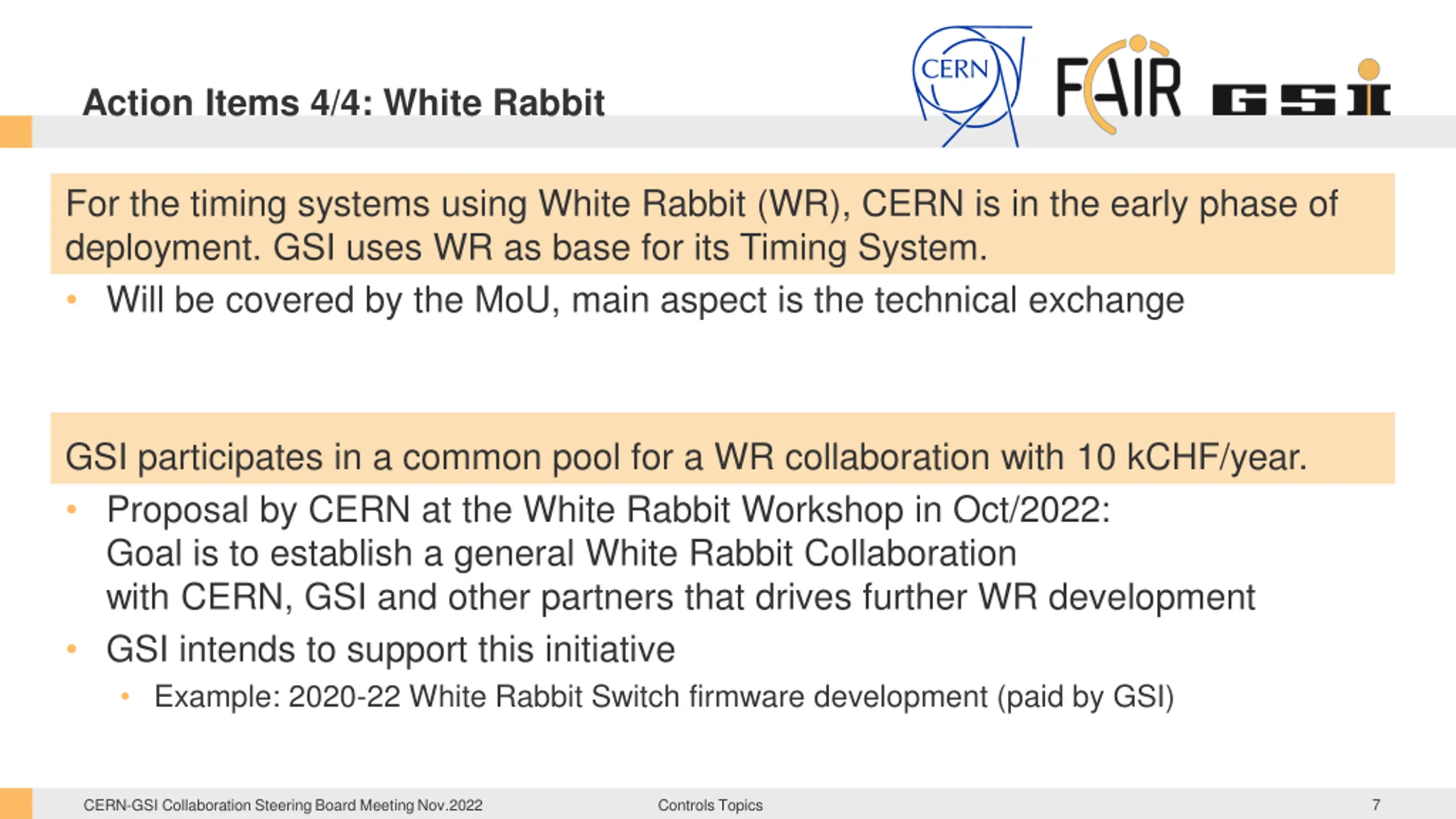 Action Items 4/4: White Rabbit For the timing systems using White Rabbit (WR), CERN is in the early phase of deployment. GSI uses WR as base for its Timing System. Will be covered by the MoU, main aspect is the technical exchange GSI participates in a common pool for a WR collaboration with 10 kCHF/year. Proposal by CERN at the White Rabbit Workshop in Oct/2022: Goal is to establish a general White Rabbit Collaboration with CERN, GSI and other partners that drives further WR development GSI intends to support this initiative Example: 2020-22 White Rabbit Switch firmware development (paid by GSI) 7 CERN-GSI Collaboration Steering Board Meeting Nov.2022 Controls Topics