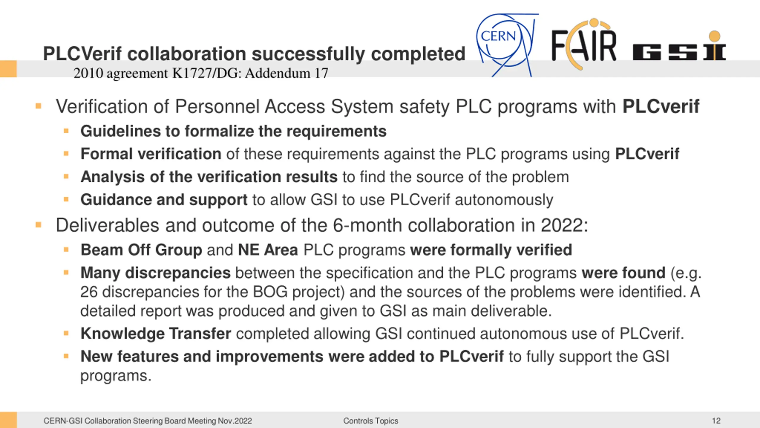 PLCVerif collaboration successfully completed 2010 agreement K1727/DG: Addendum 17 Verification of Personnel Access System safety PLC programs with PLCverif Guidelines to formalize the requirements Formal verification of these requirements against the PLC programs using PLCverif Analysis of the verification results to find the source of the problem Guidance and support to allow GSI to use PLCverif autonomously Deliverables and outcome of the 6-month collaboration in 2022: Beam Off Group and NE Area PLC programs were formally verified Many discrepancies between the specification and the PLC programs were found (e.g. 26 discrepancies for the BOG project) and the sources of the problems were identified. A detailed report was produced and given to GSI as main deliverable. Knowledge Transfer completed allowing GSI continued autonomous use of PLCverif. New features and improvements were added to PLCverif to fully support the GSI programs. 12 CERN-GSI Collaboration Steering Board Meeting Nov.2022 Controls Topics