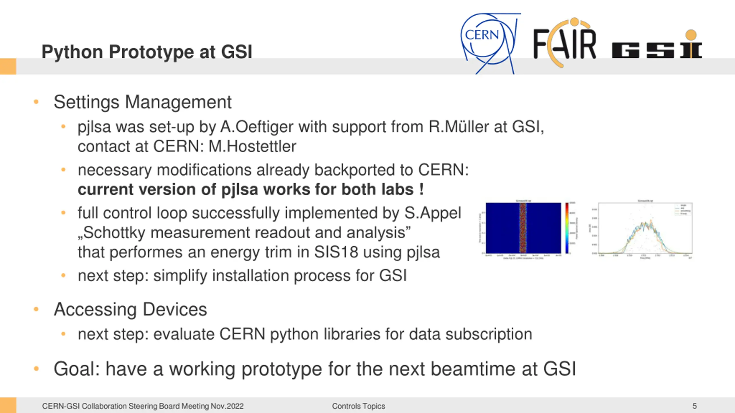 Action Items 2/4: Python A collaboration on Python has not yet been initiated. It could be of interest to reuse the CERN solution for using Python, in the GSI controls infrastructure. Alternatively, a solution could be developed at GSI that could better match the GSI controls infrastructure. Goal at GSI is to support MDs with quick python access to the Control System (a priori not intended for productive operation usage) Prototyping started at GSI on different levels: evaluate, if the CERN solution could be used at GSI 4 CERN-GSI Collaboration Steering Board Meeting Nov.2022 Controls Topics