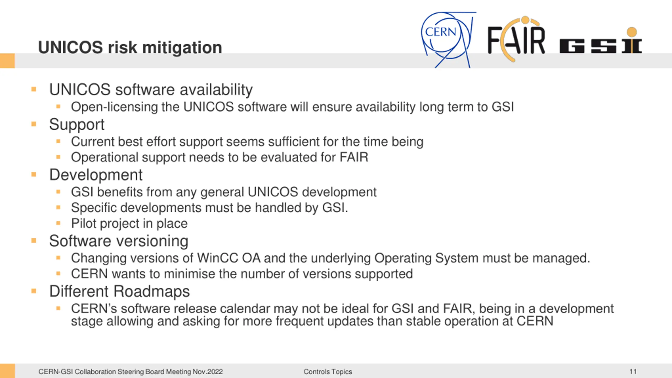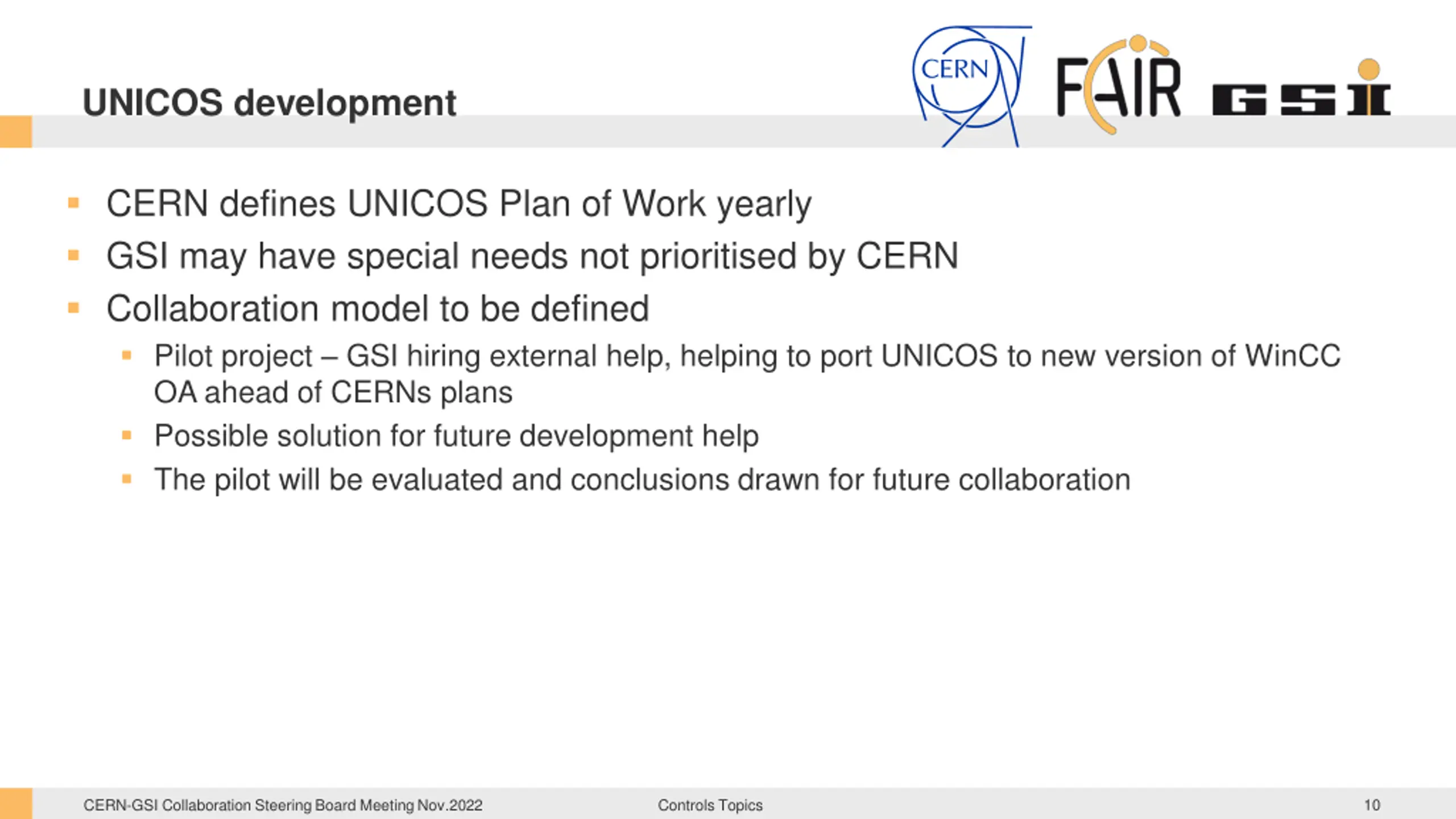 UNICOS development CERN defines UNICOS Plan of Work yearly GSI may have special needs not prioritised by CERN Collaboration model to be defined Pilot project GSI hiring external help, helping to port UNICOS to new version of WinCC OA ahead of CERNs plans Possible solution for future development help The pilot will be evaluated and conclusions drawn for future collaboration 10 CERN-GSI Collaboration Steering Board Meeting Nov.2022 Controls Topics