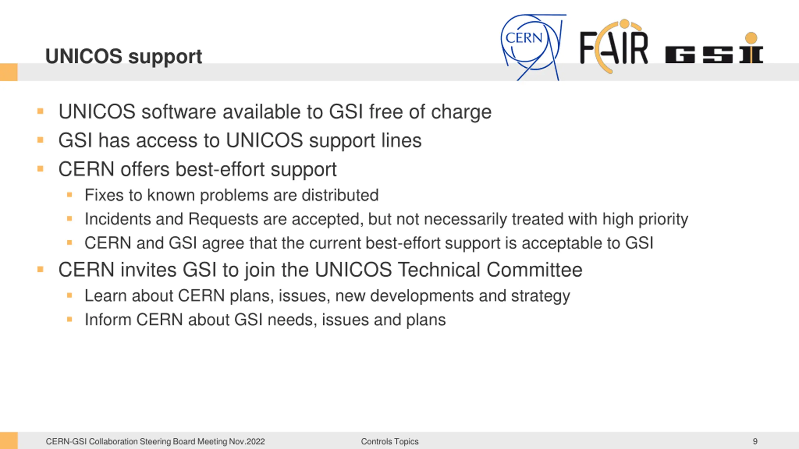 Industrial Controls with WinCC OA and UNICOS GSI uses UNICOS and WinCC OA to develop industrial control systems since several years for Vacuum, Cryogenic Controls and Access Systems WinCC OA Commercial SCADA software from Siemens / ETM GSI buys the software directly from Siemens No CERN support for incidents, requests or licenses Dependency: follow the CERN WinCC OA version for UNICOS support UNICOS Framework A CERN-developed software framework on top of WinCC OA Freely distributed to GSI Soon to be Open-source licensed to ensure availability long term for GSI and others No official collaboration agreement in place 8 CERN-GSI Collaboration Steering Board Meeting Nov.2022 Controls Topics
