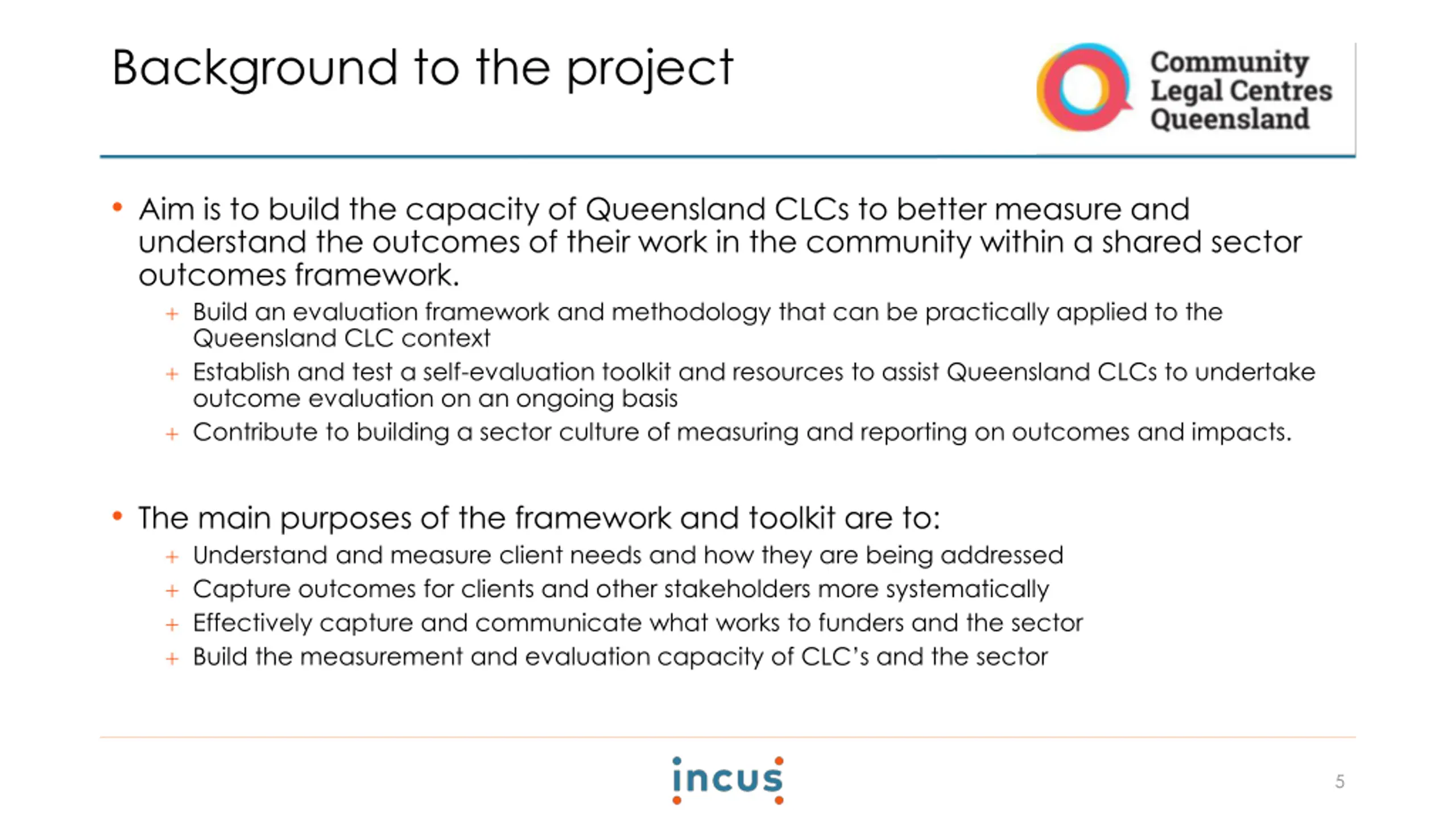 Background to the project Aim is to build the capacity of Queensland CLCs to better measure and understand the outcomes of their work in the community within a shared sector outcomes framework. + Build an evaluation framework and methodology that can be practically applied to the Queensland CLC context + Establish and test a self-evaluation toolkit and resources to assist Queensland CLCs to undertake outcome evaluation on an ongoing basis + Contribute to building a sector culture of measuring and reporting on outcomes and impacts. The main purposes of the framework and toolkit are to: + Understand and measure client needs and how they are being addressed + Capture outcomes for clients and other stakeholders more systematically + Effectively capture and communicate what works to funders and the sector + Build the measurement and evaluation capacity of CLC s and the sector 5