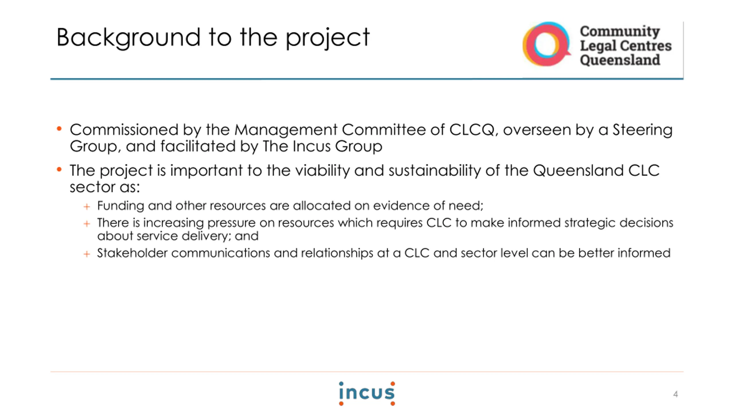 Background to the project Commissioned by the Management Committee of CLCQ, overseen by a Steering Group, and facilitated by The Incus Group The project is important to the viability and sustainability of the Queensland CLC sector as: + Funding and other resources are allocated on evidence of need; + There is increasing pressure on resources which requires CLC to make informed strategic decisions about service delivery; and + Stakeholder communications and relationships at a CLC and sector level can be better informed 4