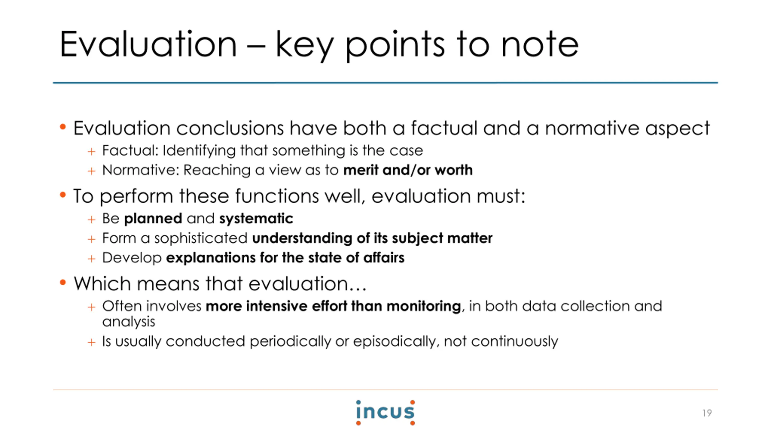 Evaluation key points to note Evaluation conclusions have both a factual and a normative aspect + Factual: Identifying that something is the case + Normative: Reaching a view as to merit and/or worth To perform these functions well, evaluation must: + Be planned and systematic + Form a sophisticated understanding of its subject matter + Develop explanations for the state of affairs Which means that evaluation + Often involves more intensive effort than monitoring, in both data collection and analysis + Is usually conducted periodically or episodically, not continuously 19