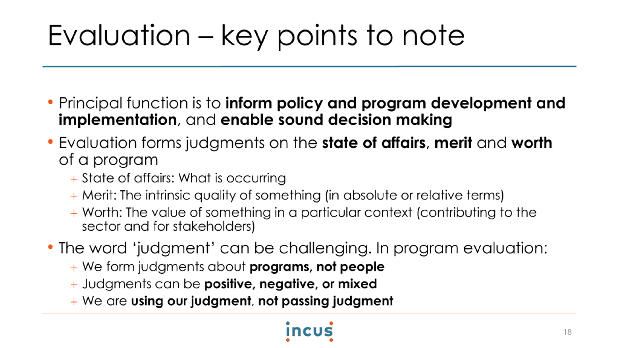 Evaluation key points to note Principal function is to inform policy and program development and implementation, and enable sound decision making Evaluation forms judgments on the state of affairs, merit and worth of a program + State of affairs: What is occurring + Merit: The intrinsic quality of something (in absolute or relative terms) + Worth: The value of something in a particular context (contributing to the sector and for stakeholders) The word judgment can be challenging. In program evaluation: + We form judgments about programs, not people + Judgments can be positive, negative, or mixed + We are using our judgment, not passing judgment 18