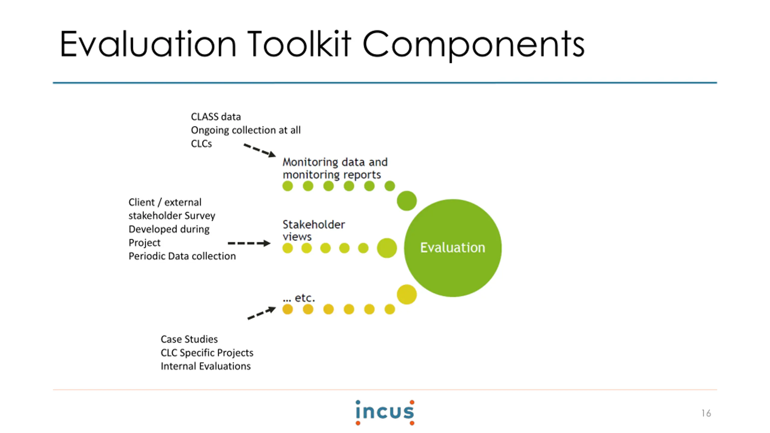 Evaluation Toolkit Components CLASS data Ongoing collection at all CLCs Client / external stakeholder Survey Developed during Project Periodic Data collection Case Studies CLC Specific Projects Internal Evaluations 16