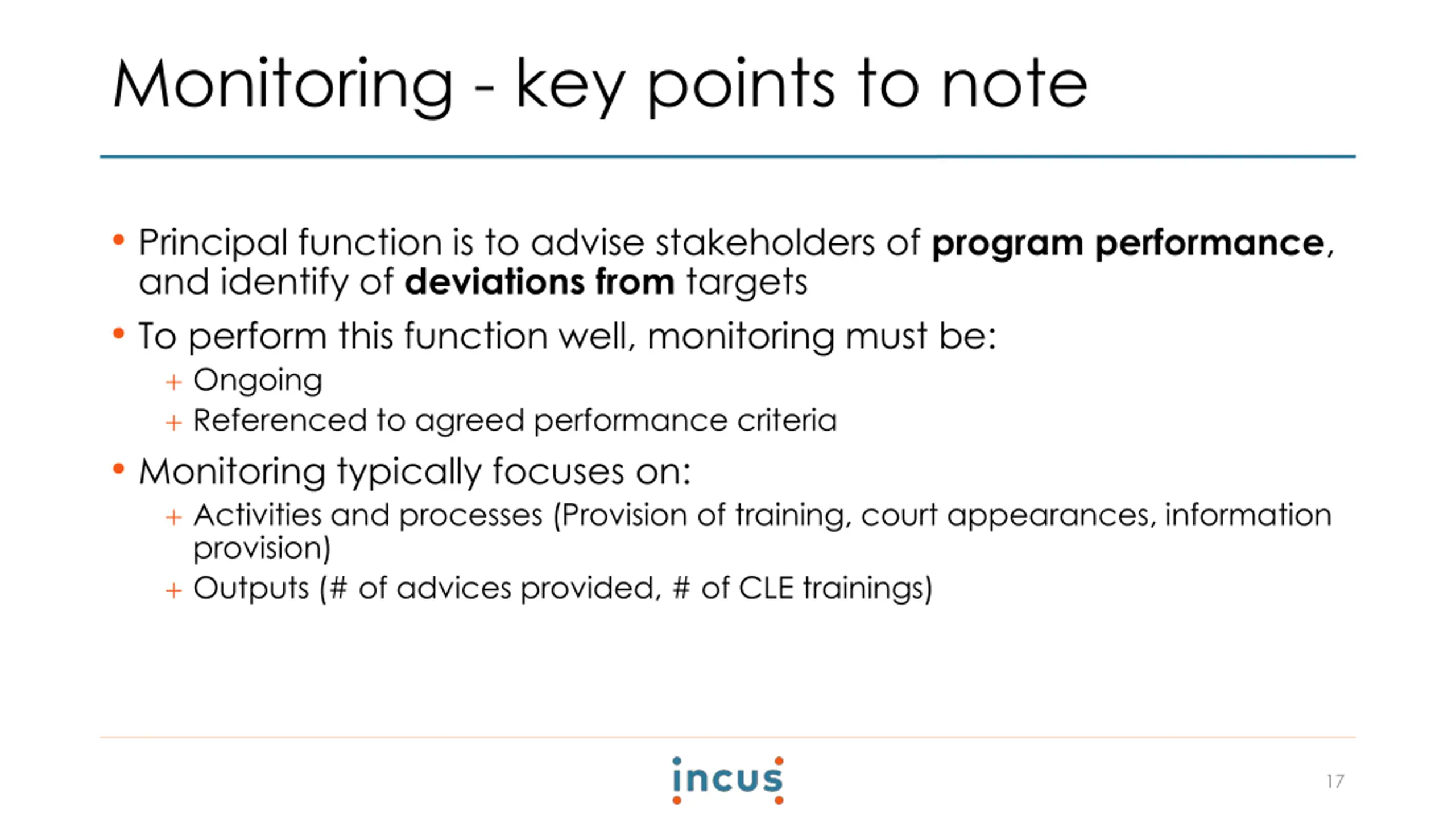 Monitoring - key points to note Principal function is to advise stakeholders of program performance, and identify of deviations from targets To perform this function well, monitoring must be: + Ongoing + Referenced to agreed performance criteria Monitoring typically focuses on: + Activities and processes (Provision of training, court appearances, information provision) + Outputs (# of advices provided, # of CLE trainings) 17