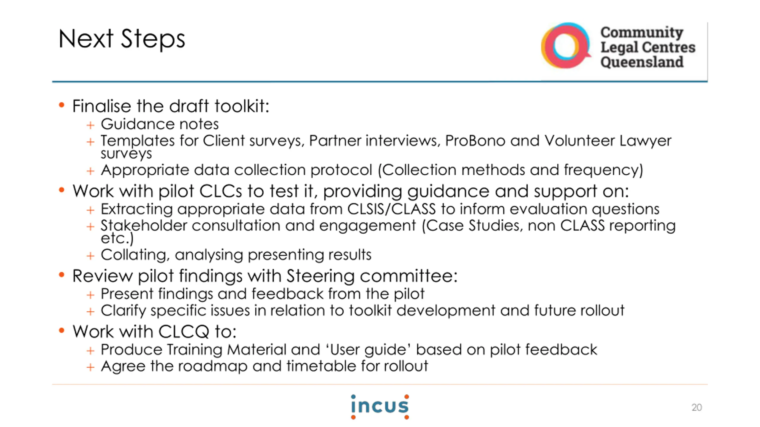 Next Steps Finalise the draft toolkit: + Guidance notes + Templates for Client surveys, Partner interviews, ProBono and Volunteer Lawyer surveys + Appropriate data collection protocol (Collection methods and frequency) Work with pilot CLCs to test it, providing guidance and support on: + Extracting appropriate data from CLSIS/CLASS to inform evaluation questions + Stakeholder consultation and engagement (Case Studies, non CLASS reporting etc.) + Collating, analysing presenting results Review pilot findings with Steering committee: + Present findings and feedback from the pilot + Clarify specific issues in relation to toolkit development and future rollout Work with CLCQ to: + Produce Training Material and User guide based on pilot feedback + Agree the roadmap and timetable for rollout 20