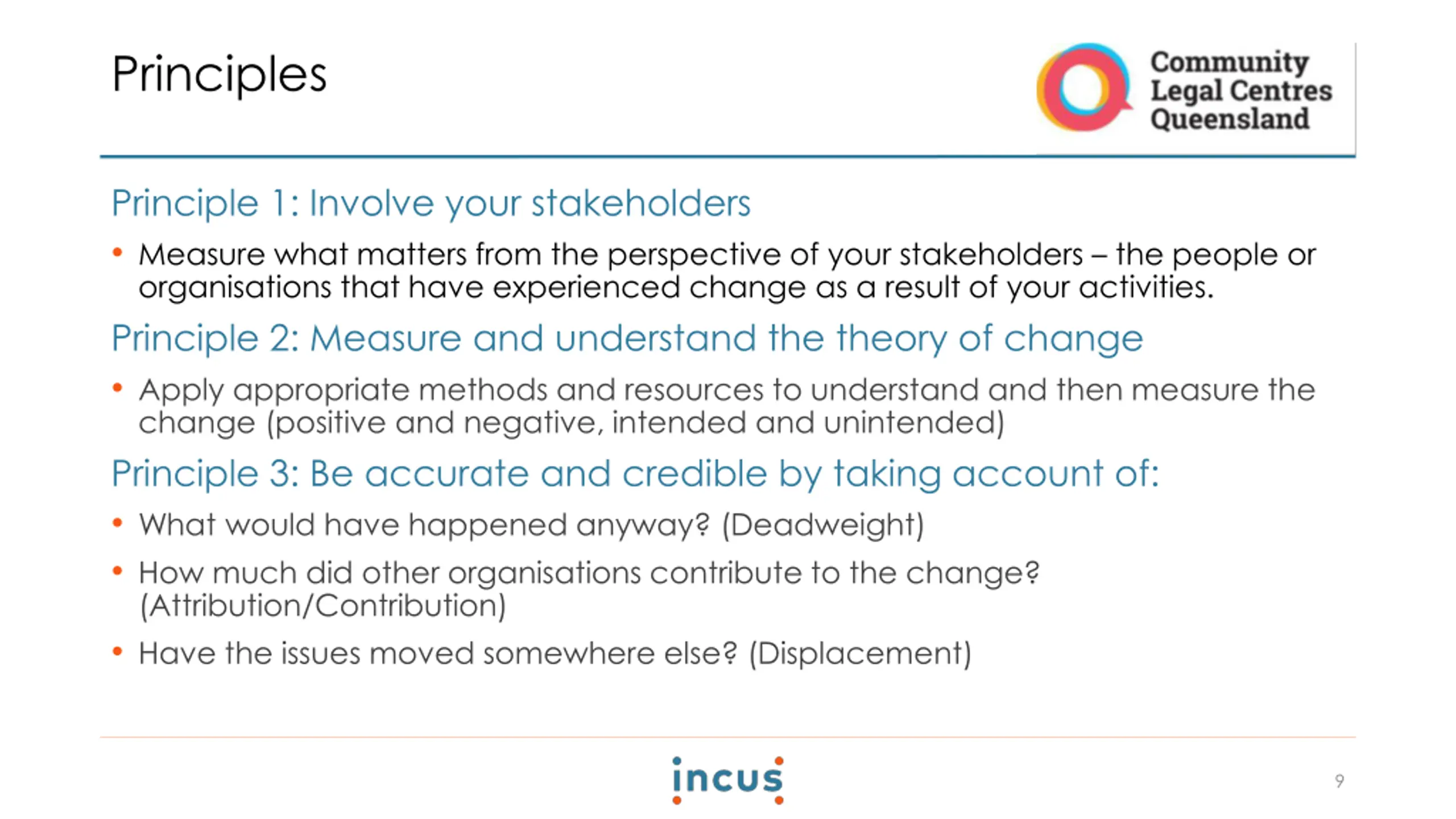 Principles Principle 1: Involve your stakeholders Measure what matters from the perspective of your stakeholders the people or organisations that have experienced change as a result of your activities. Principle 2: Measure and understand the theory of change Apply appropriate methods and resources to understand and then measure the change (positive and negative, intended and unintended) Principle 3: Be accurate and credible by taking account of: What would have happened anyway? (Deadweight) How much did other organisations contribute to the change? (Attribution/Contribution) Have the issues moved somewhere else? (Displacement) 9