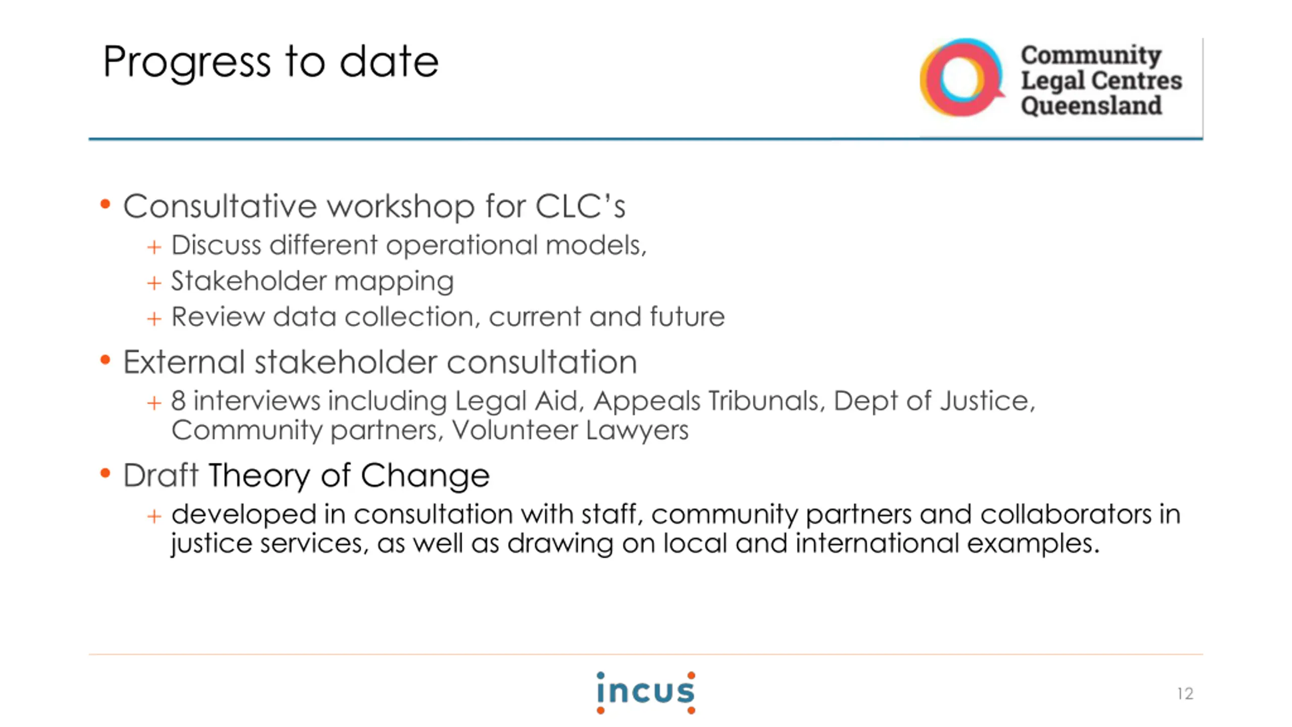Progress to date Consultative workshop for CLC s + Discuss different operational models, + Stakeholder mapping + Review data collection, current and future External stakeholder consultation + 8 interviews including Legal Aid, Appeals Tribunals, Dept of Justice, Community partners, Volunteer Lawyers Draft Theory of Change + developed in consultation with staff, community partners and collaborators in justice services, as well as drawing on local and international examples. 12