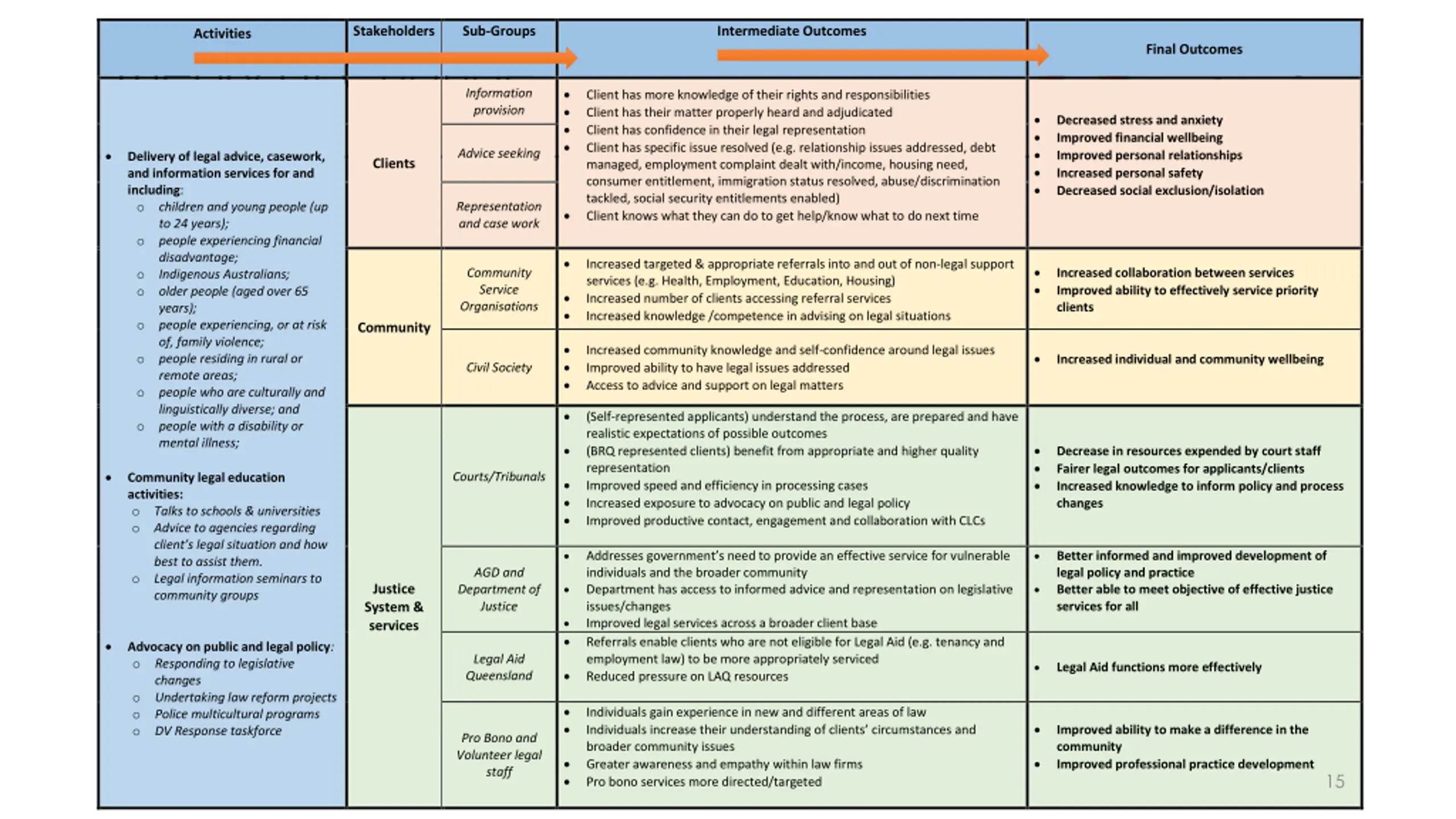 Stakeholders Sub-Groups Intermediate Outcomes Activities Theory of Change Final Outcomes Client has more knowledge of their rights and responsibilities Client has their matter properly heard and adjudicated Client has confidence in their legal representation Client has specific issue resolved (e.g. relationship issues addressed, debt managed, employment complaint dealt with/income, housing need, consumer entitlement, immigration status resolved, abuse/discrimination tackled, social security entitlements enabled) Client knows what they can do to get help/know what to do next time Information provision Decreased stress and anxiety Improved financial wellbeing Improved personal relationships Increased personal safety Decreased social exclusion/isolation Delivery of legal advice, casework, and information services for and including: ochildren and young people (up to 24 years); opeople experiencing financial disadvantage; oIndigenous Australians; oolder people (aged over 65 years); opeople experiencing, or at risk of, family violence; opeople residing in rural or remote areas; opeople who are culturally and linguistically diverse; and opeople with a disability or mental illness; Community legal education activities: oTalks to schools & universities oAdvice to agencies regarding client s legal situation and how best to assist them. oLegal information seminars to community groups Advocacy on public and legal policy: oResponding to legislative changes oUndertaking law reform projects oPolice multicultural programs oDV Response taskforce Advice seeking Clients Representation and case work Increased targeted & appropriate referrals into and out of non-legal support services (e.g. Health, Employment, Education, Housing) Increased number of clients accessing referral services Increased knowledge /competence in advising on legal situations Increased collaboration between services Improved ability to effectively service priority clients Community Service Organisations Community Increased community knowledge and self-confidence around legal issues Improved ability to have legal issues addressed Access to advice and support on legal matters Increased individual and community wellbeing Civil Society (Self-represented applicants) understand the process, are prepared and have realistic expectations of possible outcomes (BRQ represented clients) benefit from appropriate and higher quality representation Improved speed and efficiency in processing cases Increased exposure to advocacy on public and legal policy Improved productive contact, engagement and collaboration with CLCs Addresses government s need to provide an effective service for vulnerable individuals and the broader community Department has access to informed advice and representation on legislative issues/changes Improved legal services across a broader client base Referrals enable clients who are not eligible for Legal Aid (e.g. tenancy and employment law) to be more appropriately serviced Reduced pressure on LAQ resources Individuals gain experience in new and different areas of law Individuals increase their understanding of clients circumstances and broader community issues Greater awareness and empathy within law firms Pro bono services more directed/targeted Decrease in resources expended by court staff Fairer legal outcomes for applicants/clients Increased knowledge to inform policy and process changes Courts/Tribunals Better informed and improved development of legal policy and practice Better able to meet objective of effective justice services for all AGD and Department of Justice Justice System & services Legal Aid Queensland Legal Aid functions more effectively Improved ability to make a difference in the community Improved professional practice development Pro Bono and Volunteer legal staff 15