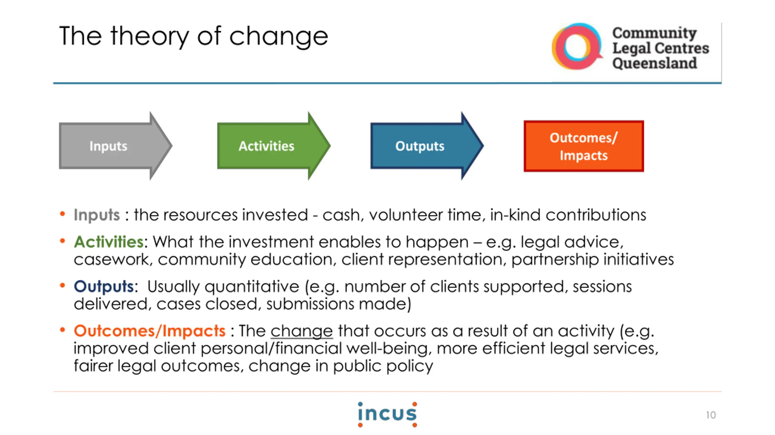 The theory of change Inputs : the resources invested - cash, volunteer time, in-kind contributions Activities: What the investment enables to happen e.g. legal advice, casework, community education, client representation, partnership initiatives Outputs: Usually quantitative (e.g. number of clients supported, sessions delivered, cases closed, submissions made) Outcomes/Impacts : The change that occurs as a result of an activity (e.g. improved client personal/financial well-being, more efficient legal services, fairer legal outcomes, change in public policy 10