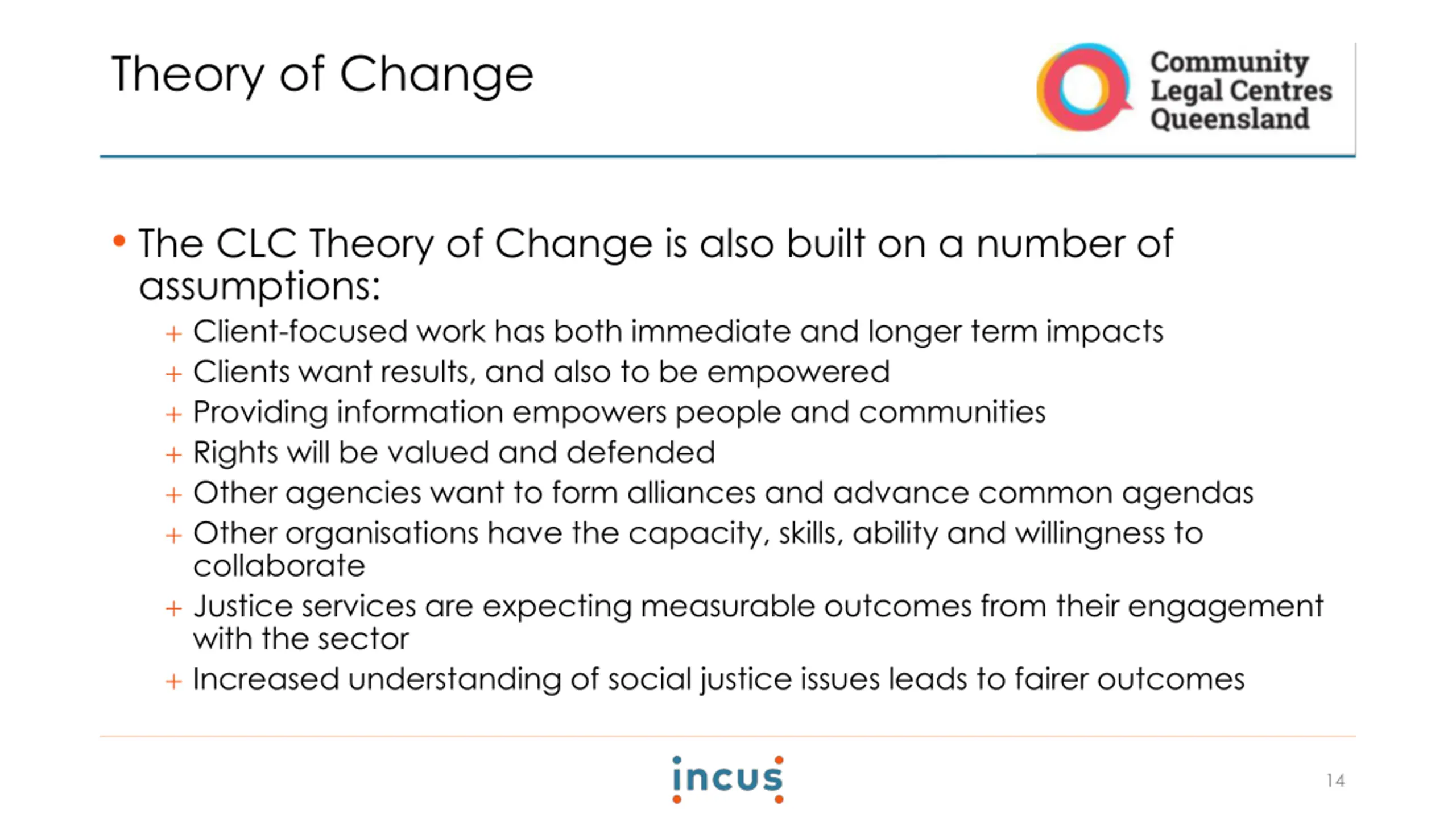 Theory of Change The CLC Theory of Change is also built on a number of assumptions: + Client-focused work has both immediate and longer term impacts + Clients want results, and also to be empowered + Providing information empowers people and communities + Rights will be valued and defended + Other agencies want to form alliances and advance common agendas + Other organisations have the capacity, skills, ability and willingness to collaborate + Justice services are expecting measurable outcomes from their engagement with the sector + Increased understanding of social justice issues leads to fairer outcomes 14