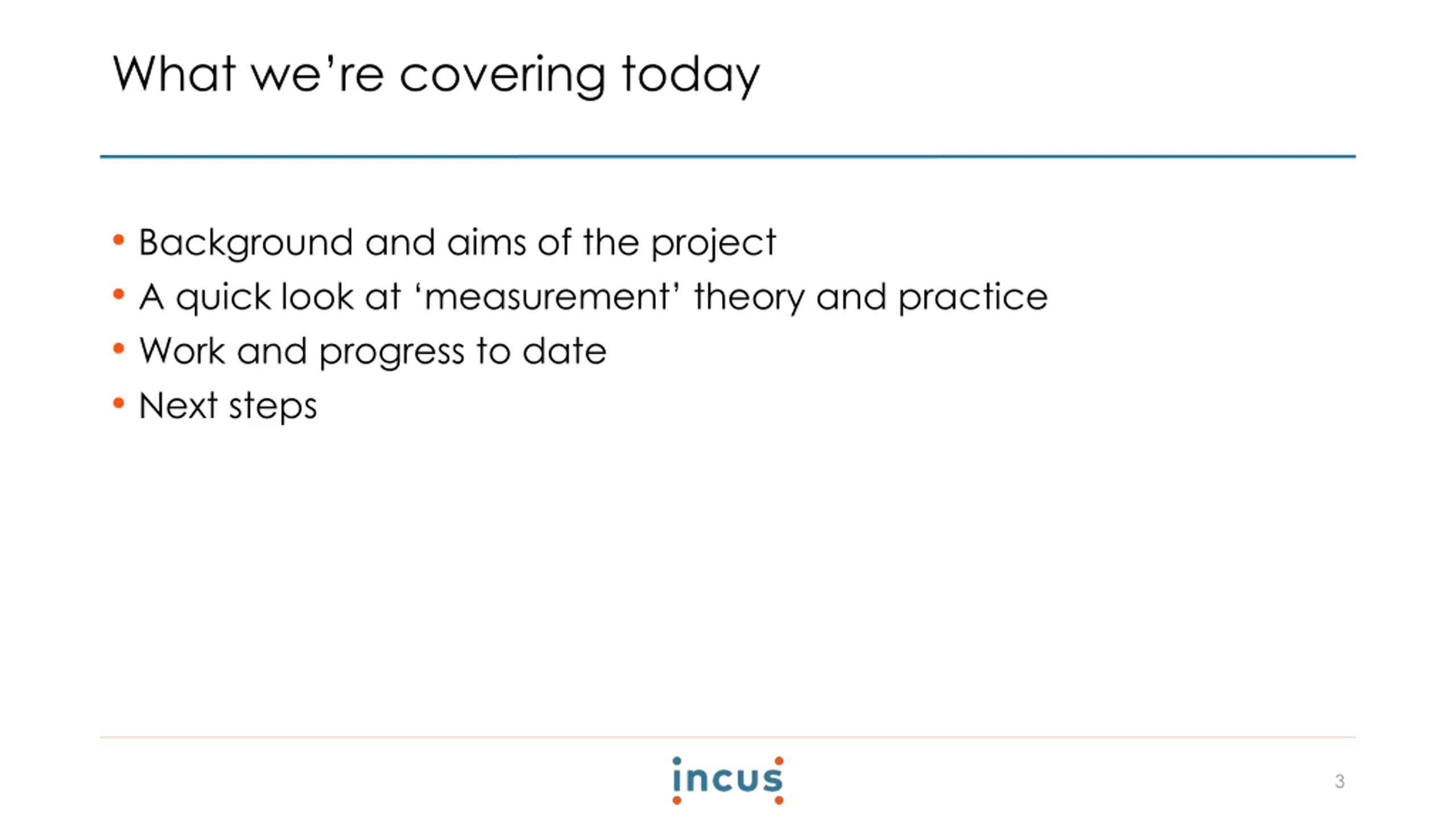 What were covering today Background and aims of the project A quick look at measurement theory and practice Work and progress to date Next steps 3