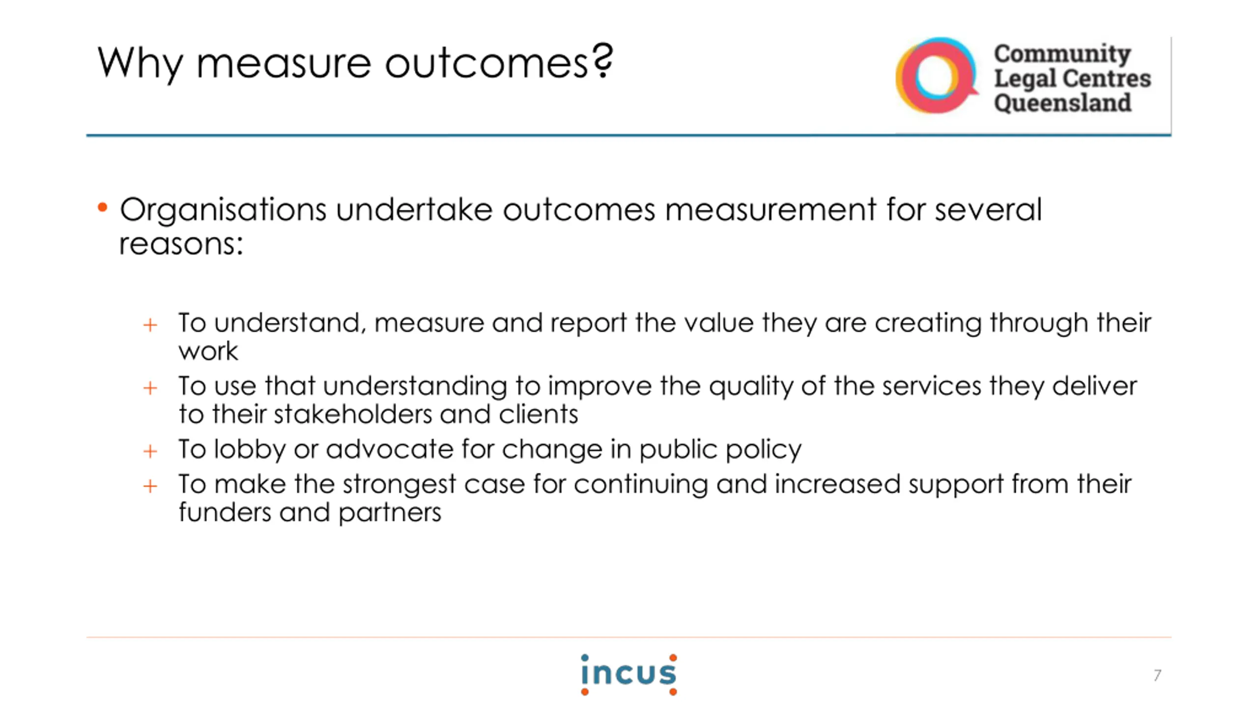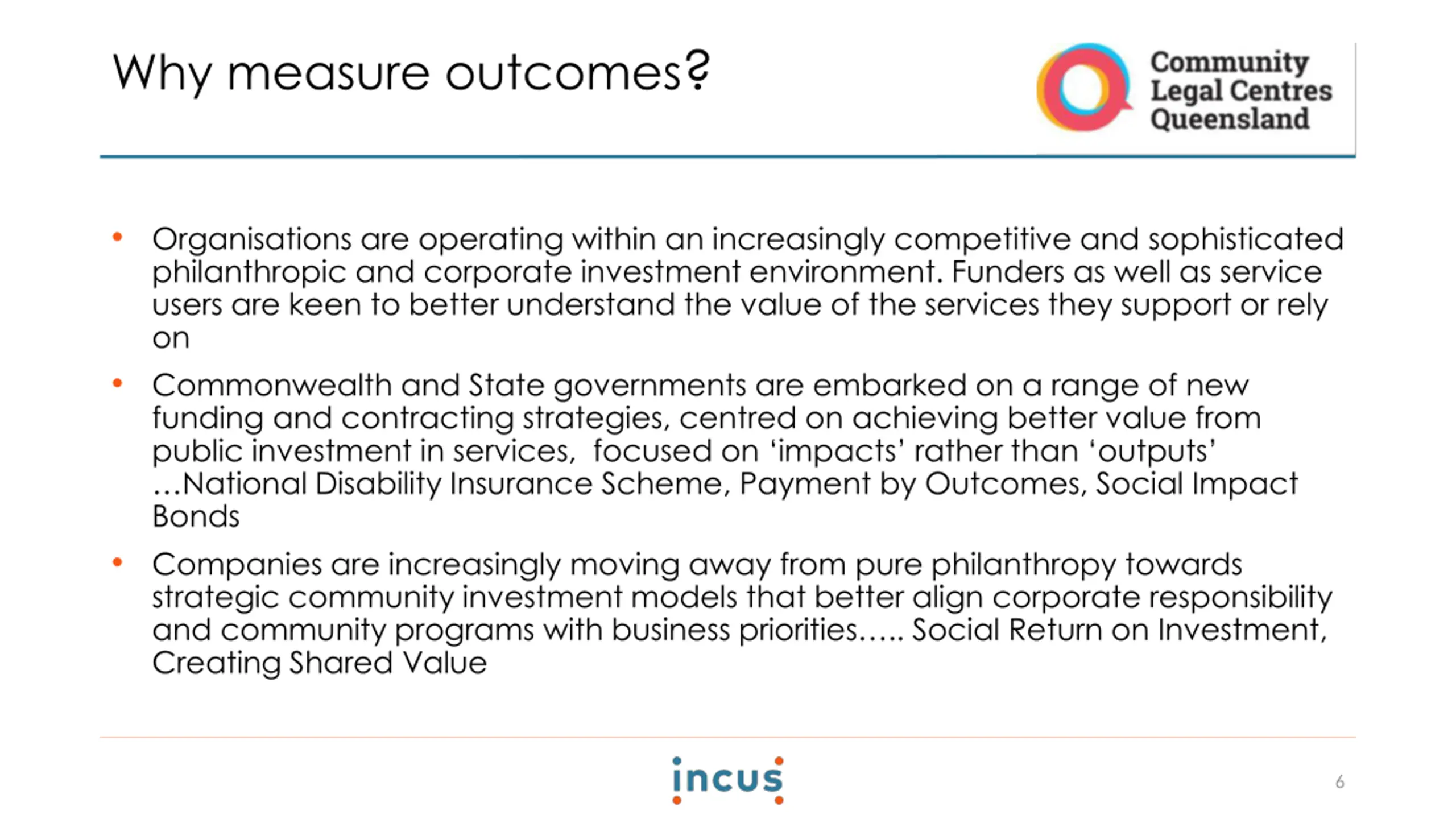 Why measure outcomes? Organisations are operating within an increasingly competitive and sophisticated philanthropic and corporate investment environment. Funders as well as service users are keen to better understand the value of the services they support or rely on Commonwealth and State governments are embarked on a range of new funding and contracting strategies, centred on achieving better value from public investment in services, focused on impacts rather than outputs National Disability Insurance Scheme, Payment by Outcomes, Social Impact Bonds Companies are increasingly moving away from pure philanthropy towards strategic community investment models that better align corporate responsibility and community programs with business priorities .. Social Return on Investment, Creating Shared Value 6