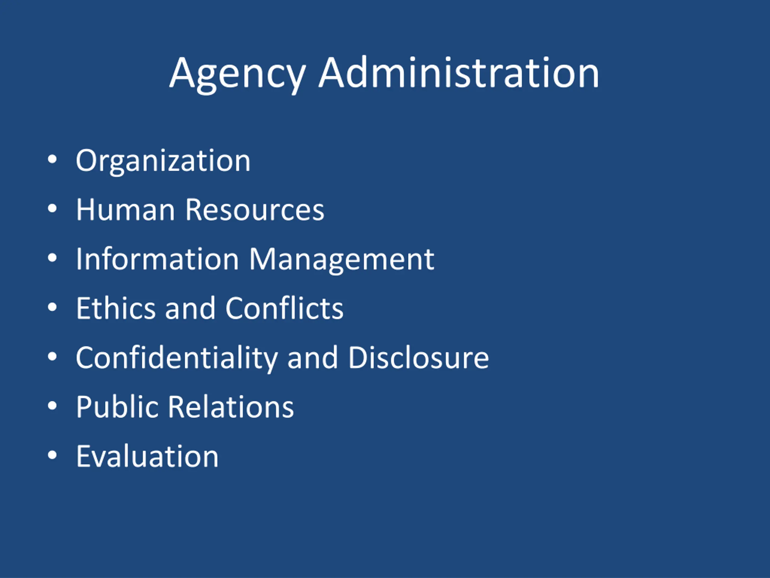Agency Administration Organization Human Resources Information Management Ethics and Conflicts Confidentiality and Disclosure Public Relations Evaluation