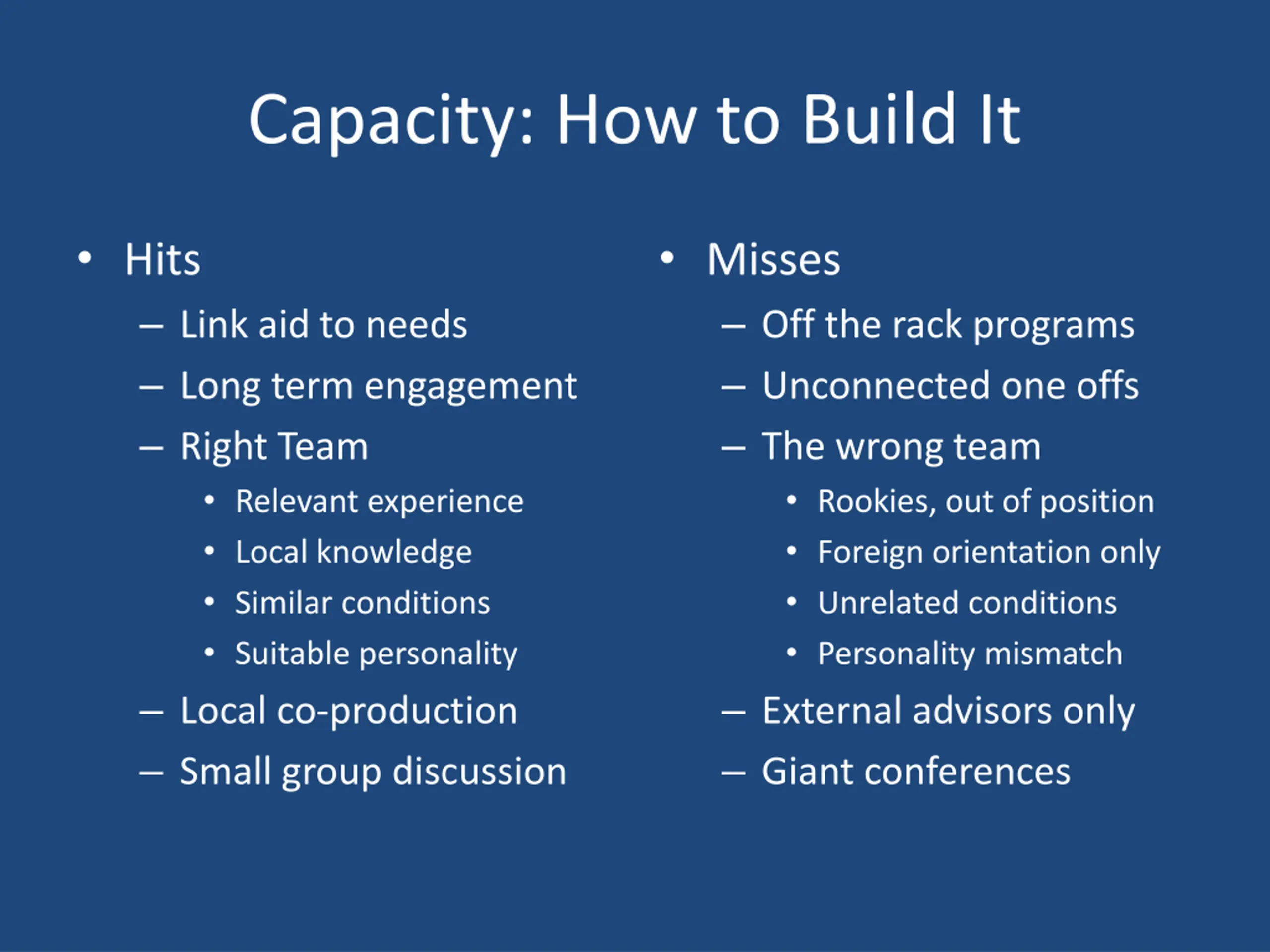 Capacity: How to Build It Hits Misses Off the rack programs Unconnected one offs The wrong team Rookies, out of position Foreign orientation only Unrelated conditions Personality mismatch External advisors only Giant conferences Link aid to needs Long term engagement Right Team Relevant experience Local knowledge Similar conditions Suitable personality Local co-production Small group discussion