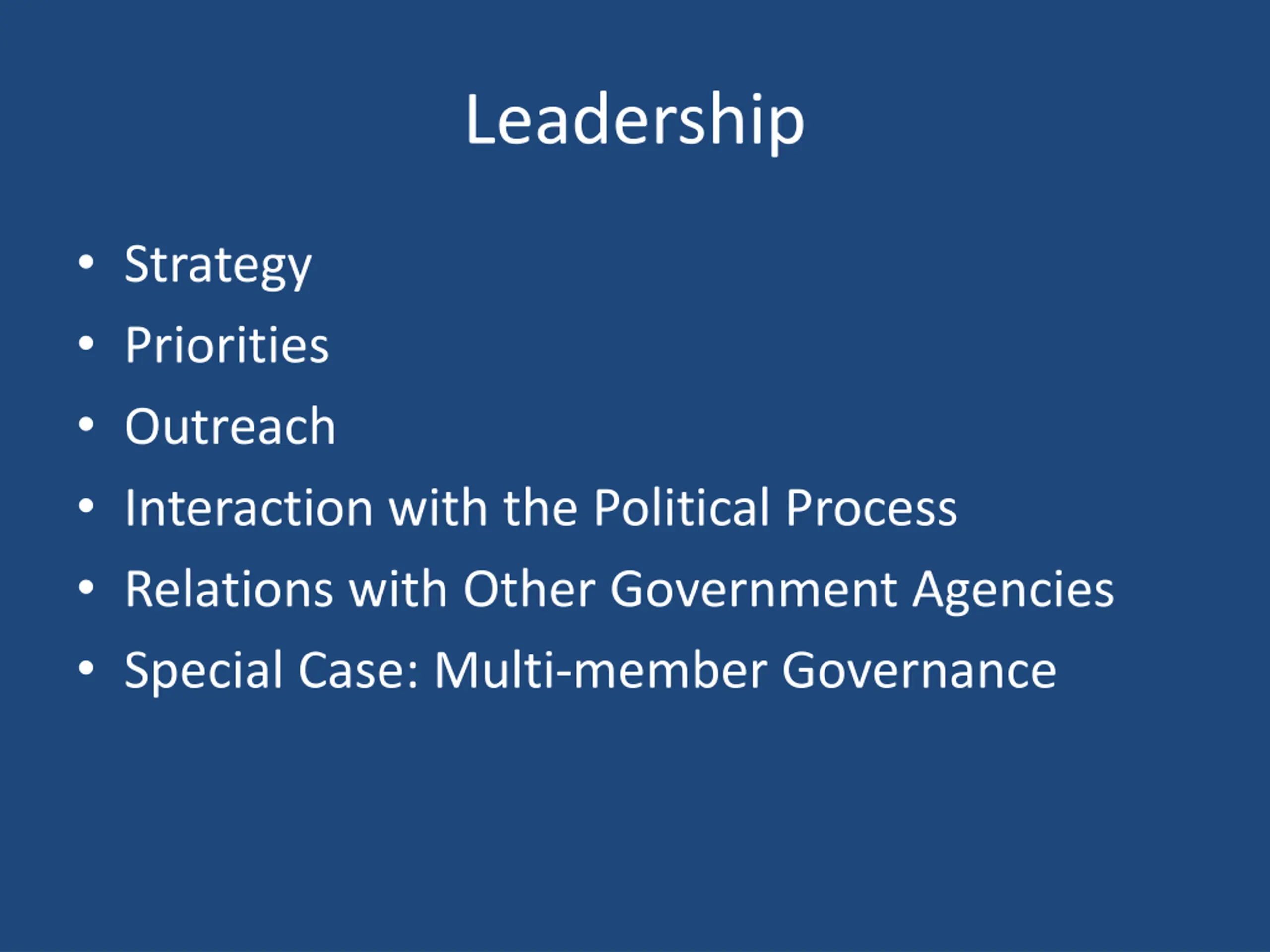 Leadership Strategy Priorities Outreach Interaction with the Political Process Relations with Other Government Agencies Special Case: Multi-member Governance