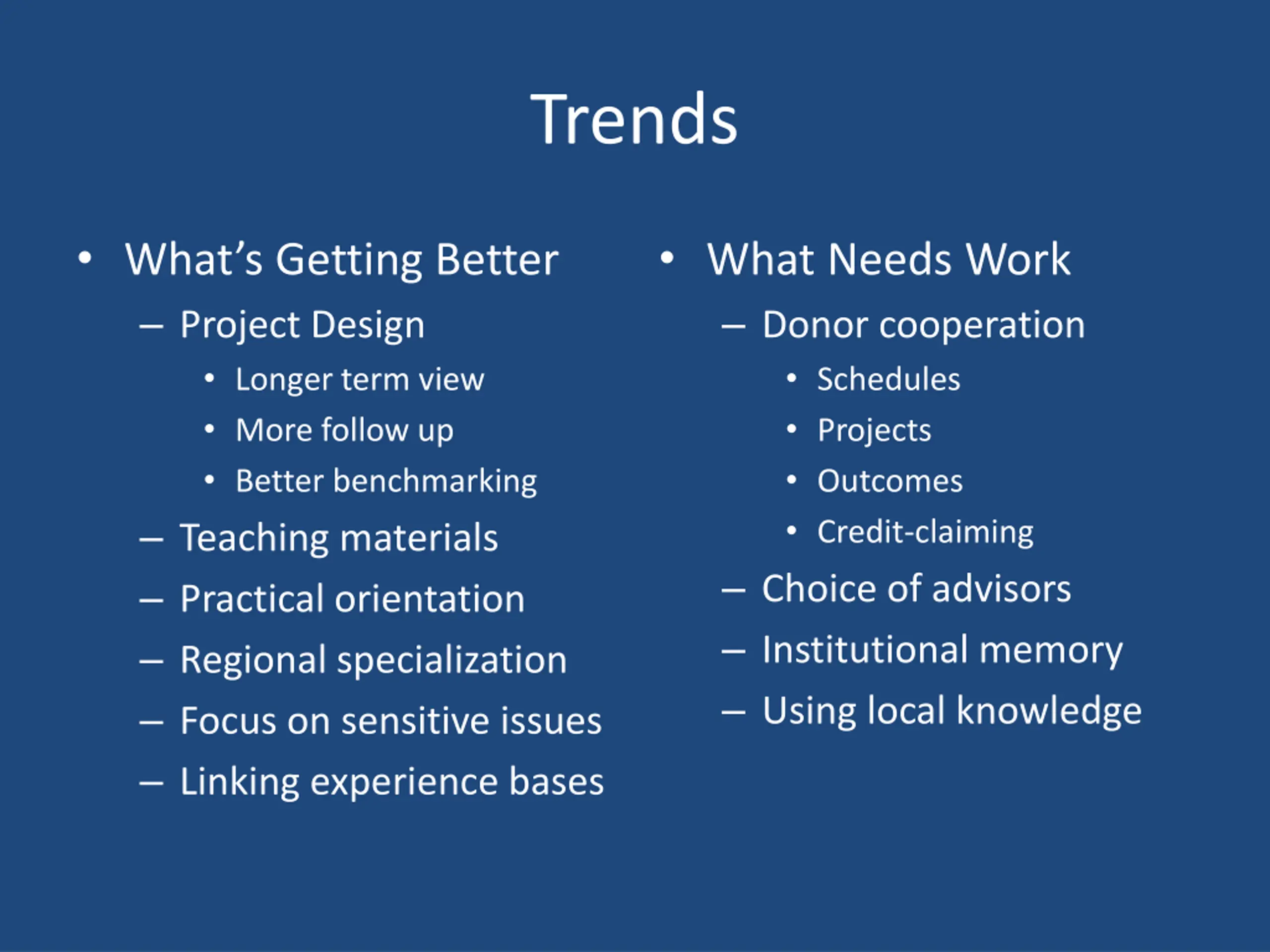 Trends What s Getting Better Project Design Longer term view More follow up Better benchmarking Teaching materials Practical orientation Regional specialization Focus on sensitive issues Linking experience bases What Needs Work Donor cooperation Schedules Projects Outcomes Credit-claiming Choice of advisors Institutional memory Using local knowledge