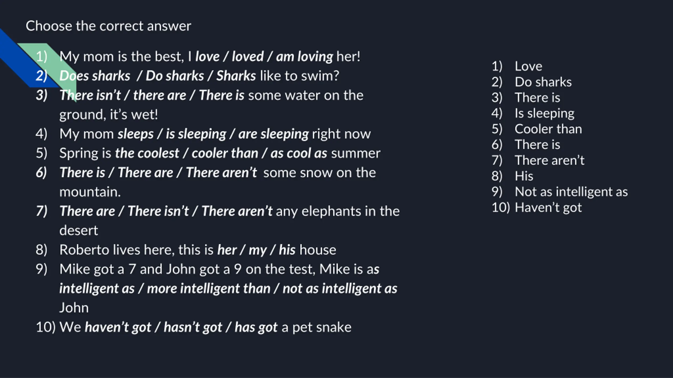 Choose the correct answer 1) My mom is the best, I love / loved / am loving her! 2) Does sharks / Do sharks / Sharks like to swim? 3) There isn t / there are / There is some water on the ground, it s wet! 4) My mom sleeps / is sleeping / are sleeping right now 5) Spring is the coolest / cooler than / as cool as summer 6) There is / There are / There aren t some snow on the mountain. 7) There are / There isn t / There aren t any elephants in the desert 8) Roberto lives here, this is her / my / his house 9) Mike got a 7 and John got a 9 on the test, Mike is as intelligent as / more intelligent than / not as intelligent as John 10) We haven t got / hasn t got / has got a pet snake 1) 2) 3) 4) 5) 6) 7) 8) 9) 10) Haven t got Love Do sharks There is Is sleeping Cooler than There is There aren t His Not as intelligent as