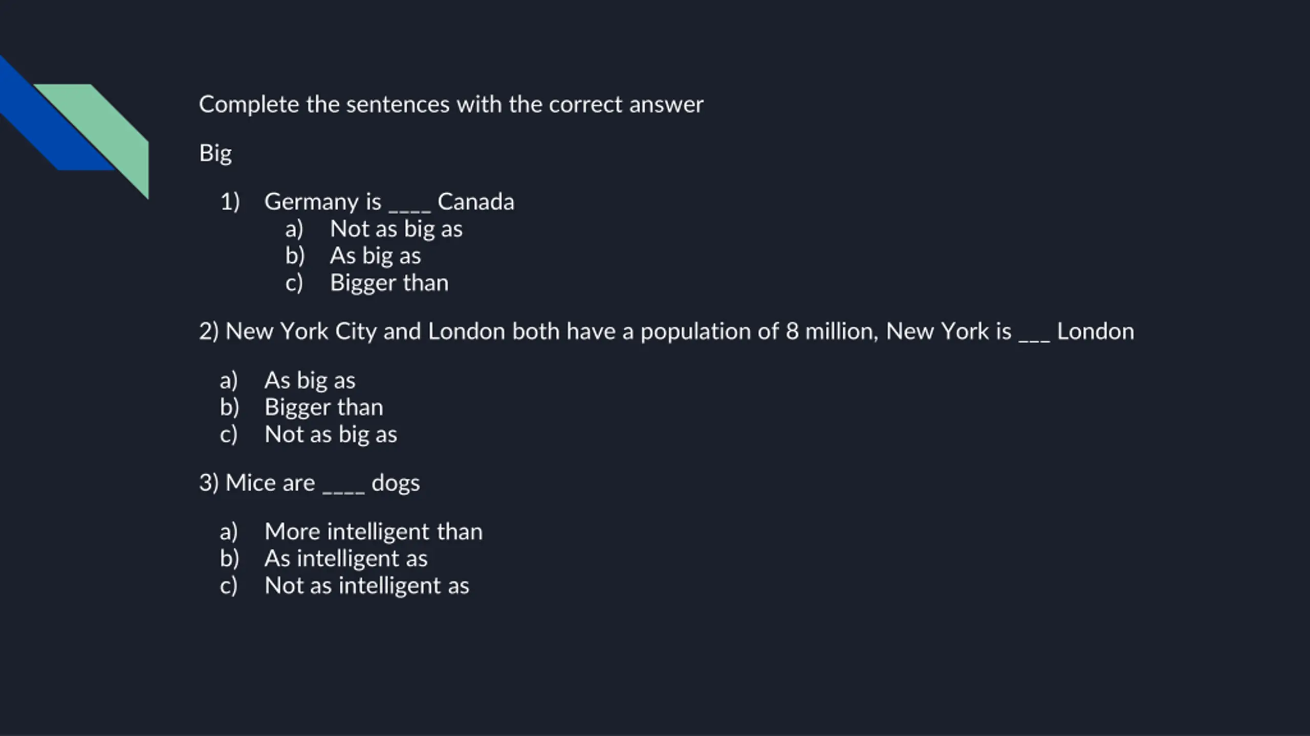 Complete the sentences with the correct answer Big 1) Germany is ____ Canada a) Not as big as b) As big as c) Bigger than 2) New York City and London both have a population of 8 million, New York is ___ London a) b) c) As big as Bigger than Not as big as 3) Mice are ____ dogs a) b) c) More intelligent than As intelligent as Not as intelligent as