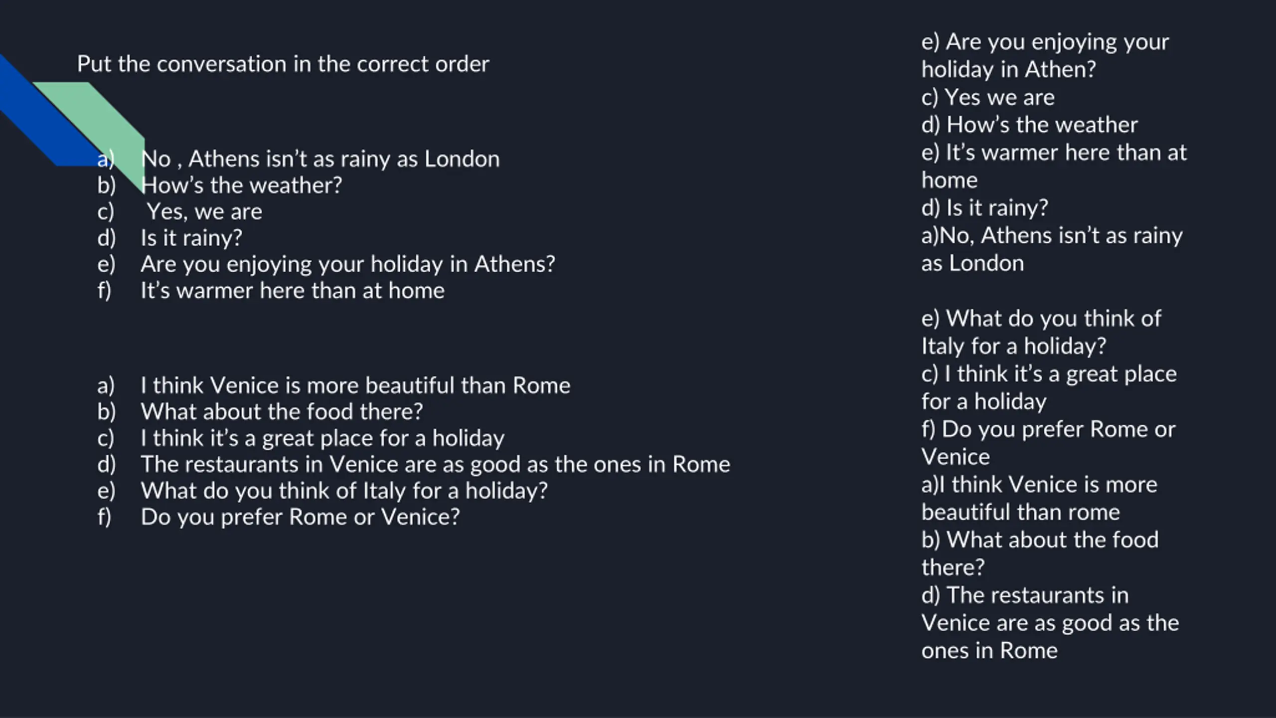 e) Are you enjoying your holiday in Athen? c) Yes we are d) How s the weather e) It s warmer here than at home d) Is it rainy? a)No, Athens isn t as rainy as London Put the conversation in the correct order a) b) c) d) e) f) No , Athens isn t as rainy as London How s the weather? Yes, we are Is it rainy? Are you enjoying your holiday in Athens? It s warmer here than at home e) What do you think of Italy for a holiday? c) I think it s a great place for a holiday f) Do you prefer Rome or Venice a)I think Venice is more beautiful than rome b) What about the food there? d) The restaurants in Venice are as good as the ones in Rome a) b) c) d) e) f) I think Venice is more beautiful than Rome What about the food there? I think it s a great place for a holiday The restaurants in Venice are as good as the ones in Rome What do you think of Italy for a holiday? Do you prefer Rome or Venice?
