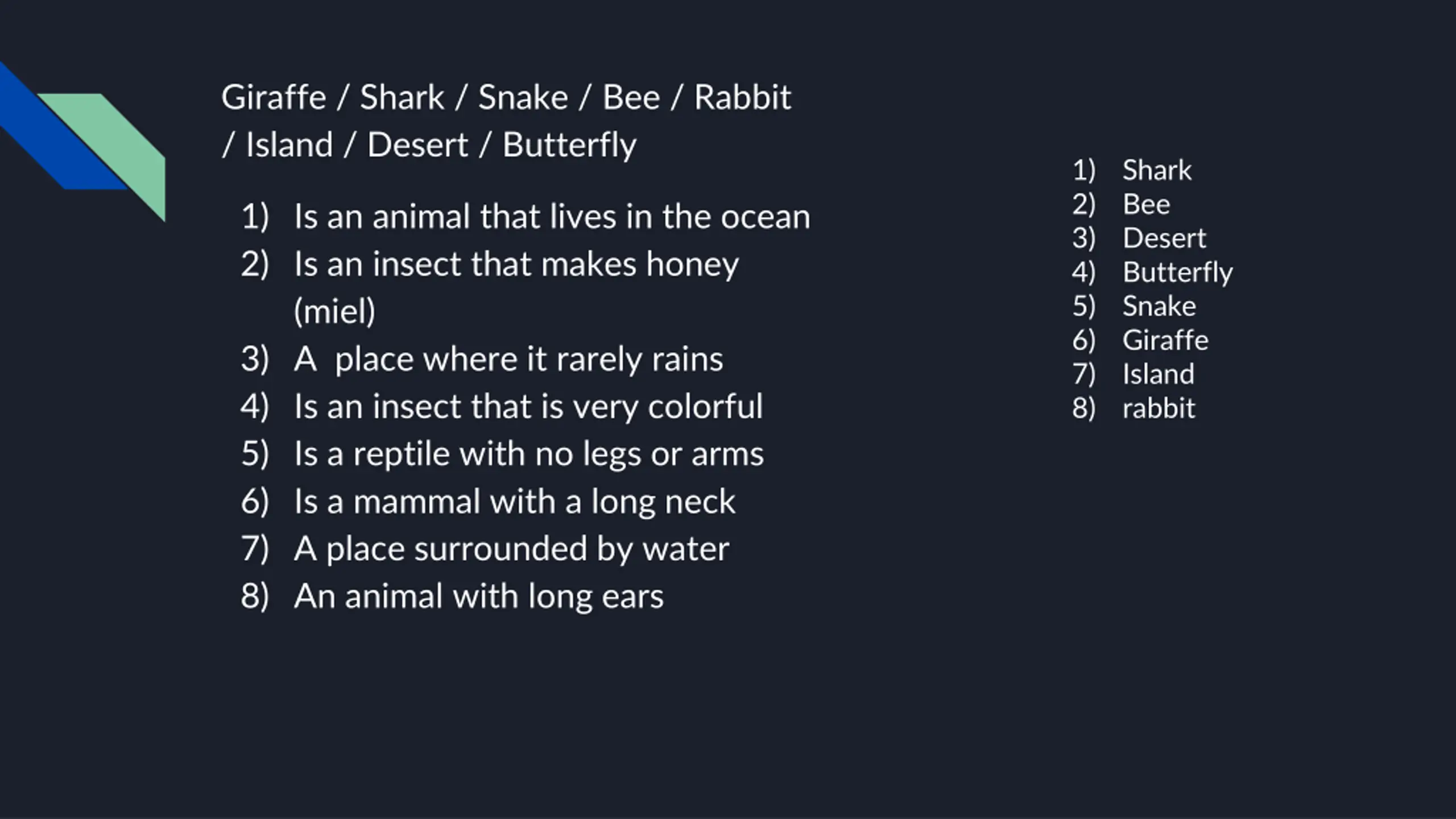 Giraffe / Shark / Snake / Bee / Rabbit / Island / Desert / Butterfly 1) 2) 3) 4) 5) 6) 7) 8) Shark Bee Desert Butterfly Snake Giraffe Island rabbit 1) Is an animal that lives in the ocean 2) Is an insect that makes honey (miel) 3) A place where it rarely rains 4) Is an insect that is very colorful 5) Is a reptile with no legs or arms 6) Is a mammal with a long neck 7) A place surrounded by water 8) An animal with long ears