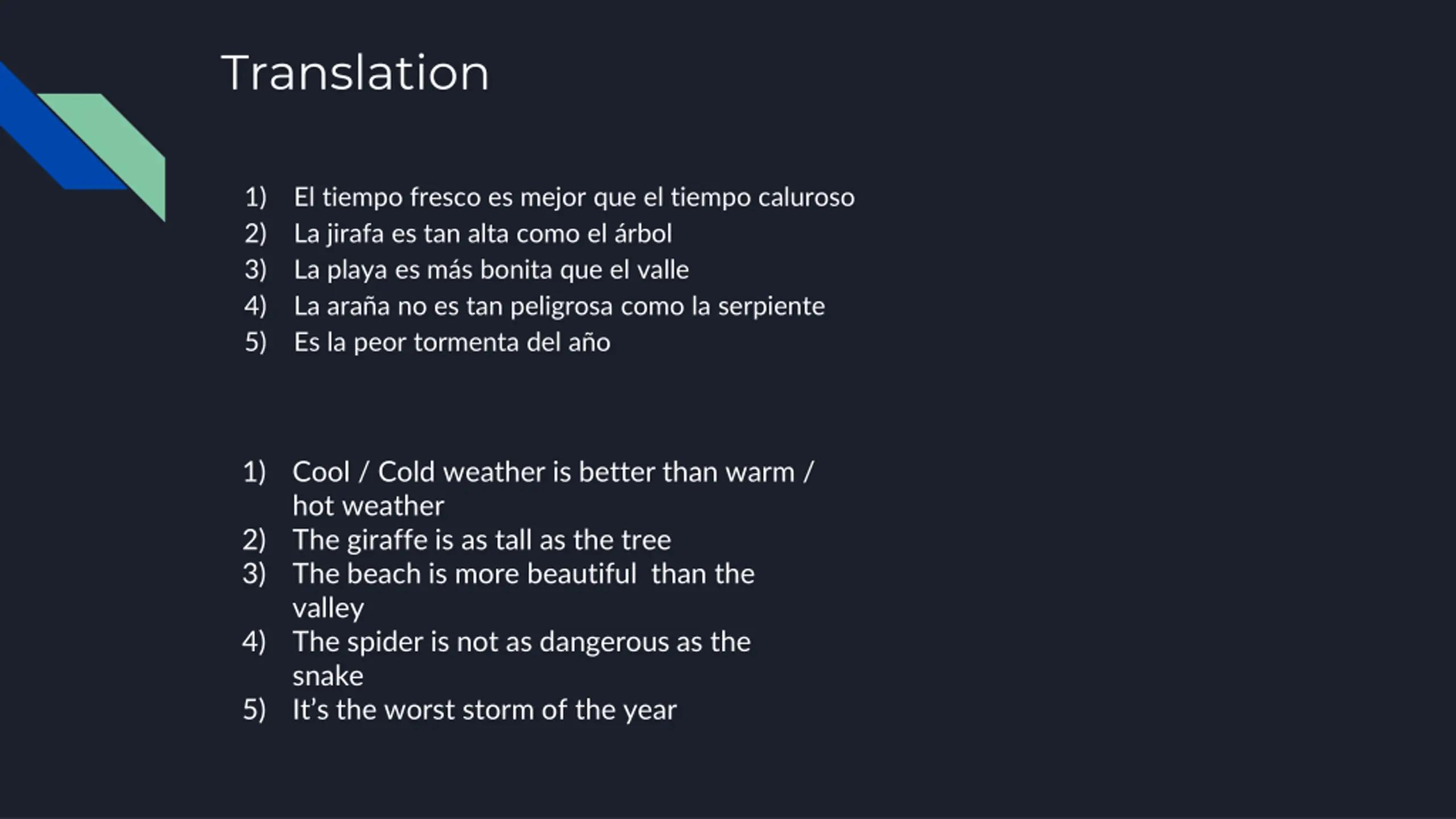 Translation 1) 2) 3) 4) 5) El tiempo fresco es mejor que el tiempo caluroso La jirafa es tan alta como el rbol La playa es m s bonita que el valle La ara a no es tan peligrosa como la serpiente Es la peor tormenta del a o 1) Cool / Cold weather is better than warm / hot weather The giraffe is as tall as the tree The beach is more beautiful than the valley The spider is not as dangerous as the snake It s the worst storm of the year 2) 3) 4) 5)