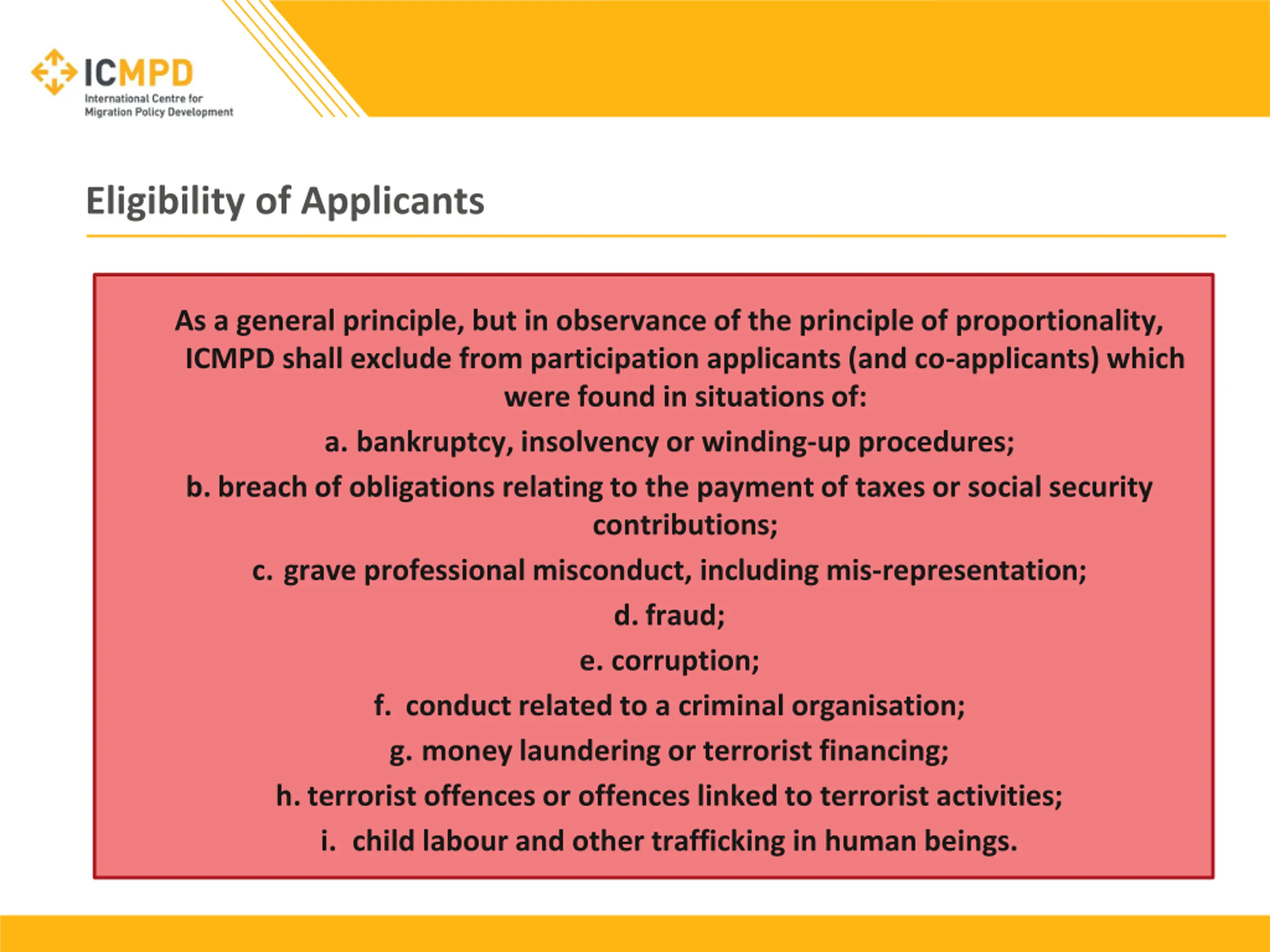 Eligibility of Applicants As a general principle, but in observance of the principle of proportionality, ICMPD shall exclude from participation applicants (and co-applicants) which were found in situations of: a. bankruptcy, insolvency or winding-up procedures; b.breach of obligations relating to the payment of taxes or social security contributions; c. grave professional misconduct, including mis-representation; d.fraud; e. corruption; f. conduct related to a criminal organisation; g. money laundering or terrorist financing; h.terrorist offences or offences linked to terrorist activities; i. child labour and other trafficking in human beings.