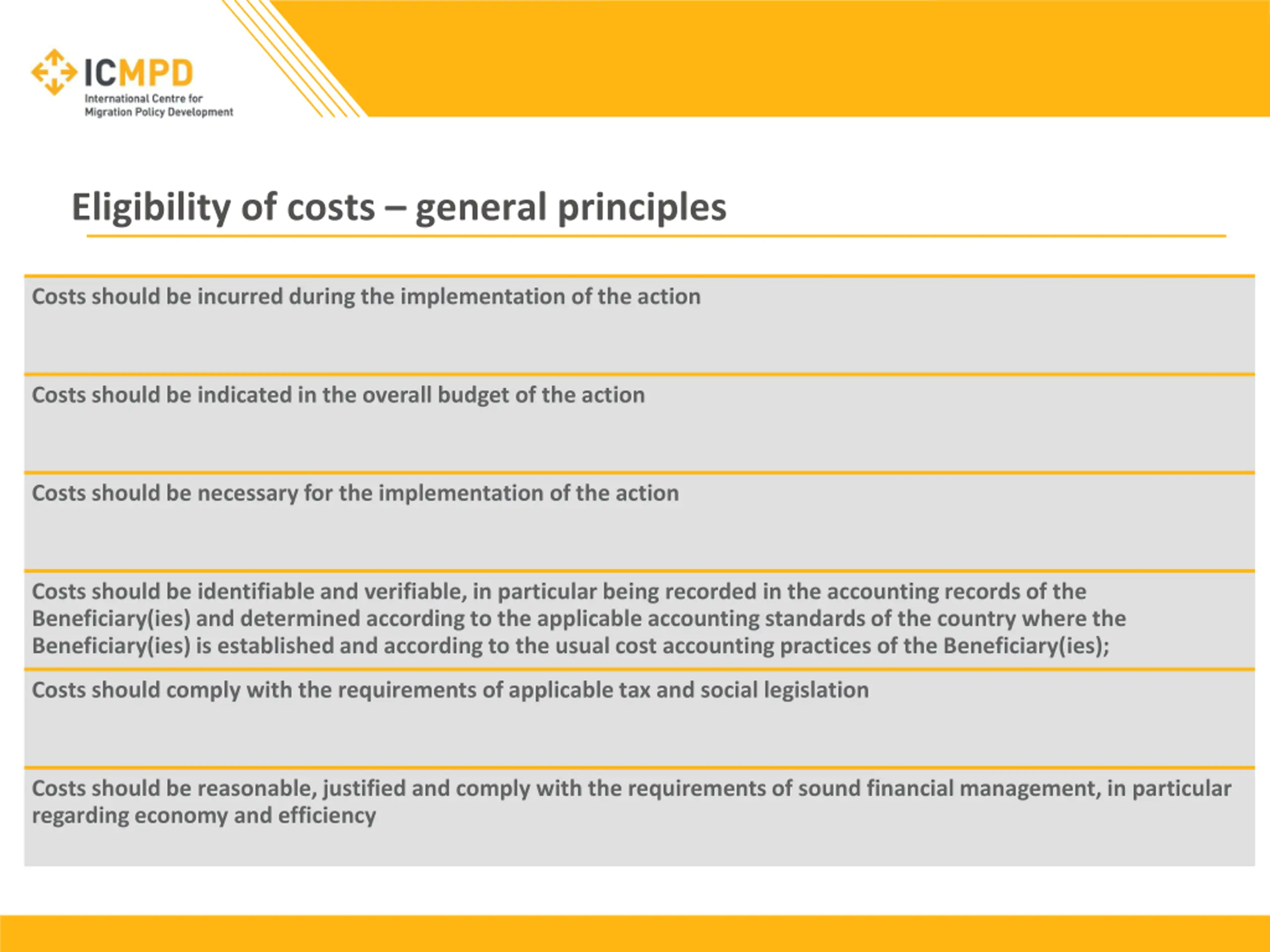 Eligibility of costs general principles Costs should be incurred during the implementation of the action Costs should be indicated in the overall budget of the action Costs should be necessary for the implementation of the action Costs should be identifiable and verifiable, in particular being recorded in the accounting records of the Beneficiary(ies) and determined according to the applicable accounting standards of the country where the Beneficiary(ies) is established and according to the usual cost accounting practices of the Beneficiary(ies); Costs should comply with the requirements of applicable tax and social legislation Costs should be reasonable, justified and comply with the requirements of sound financial management, in particular regarding economy and efficiency