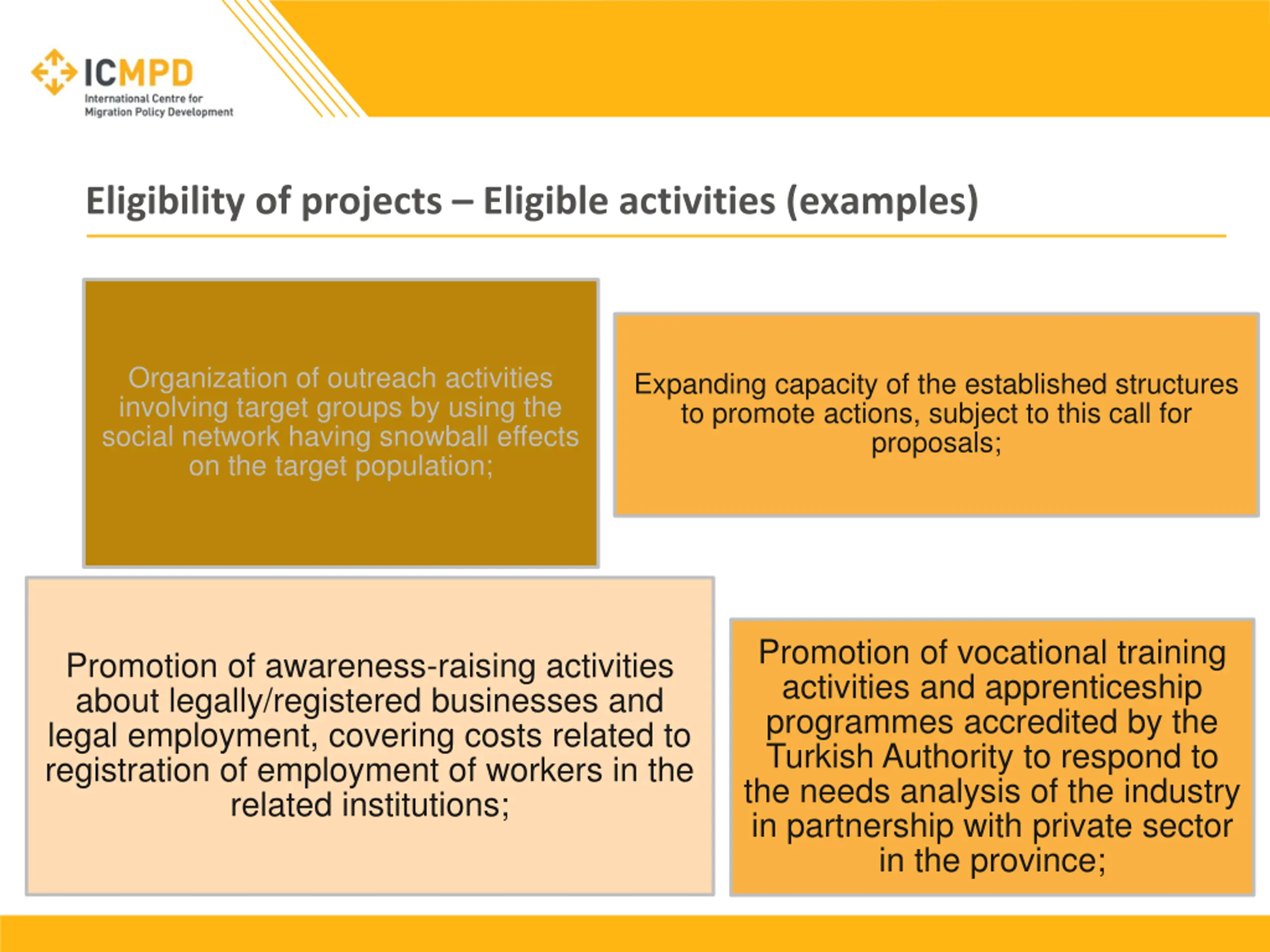 Eligibility of projects Eligible activities (examples) Organization of outreach activities involving target groups by using the social network having snowball effects on the target population; Expanding capacity of the established structures to promote actions, subject to this call for proposals; Promotion of vocational training activities and apprenticeship programmes accredited by the Turkish Authority to respond to the needs analysis of the industry in partnership with private sector in the province; Promotion of awareness-raising activities about legally/registered businesses and legal employment, covering costs related to registration of employment of workers in the related institutions;