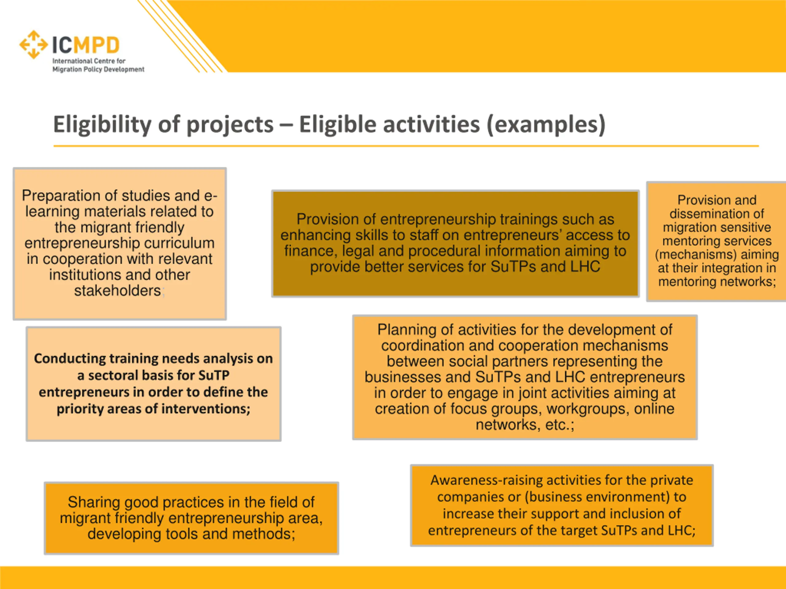 Eligibility of projects Eligible activities (examples) Preparation of studies and e- learning materials related to the migrant friendly entrepreneurship curriculum in cooperation with relevant institutions and other stakeholders; Provision and dissemination of migration sensitive mentoring services (mechanisms) aiming at their integration in mentoring networks; Provision of entrepreneurship trainings such as enhancing skills to staff on entrepreneurs access to finance, legal and procedural information aiming to provide better services for SuTPs and LHC Planning of activities for the development of coordination and cooperation mechanisms between social partners representing the businesses and SuTPs and LHC entrepreneurs in order to engage in joint activities aiming at creation of focus groups, workgroups, online networks, etc.; Conducting training needs analysis on a sectoral basis for SuTP entrepreneurs in order to define the priority areas of interventions; Awareness-raising activities for the private companies or (business environment) to increase their support and inclusion of entrepreneurs of the target SuTPs and LHC; Sharing good practices in the field of migrant friendly entrepreneurship area, developing tools and methods;