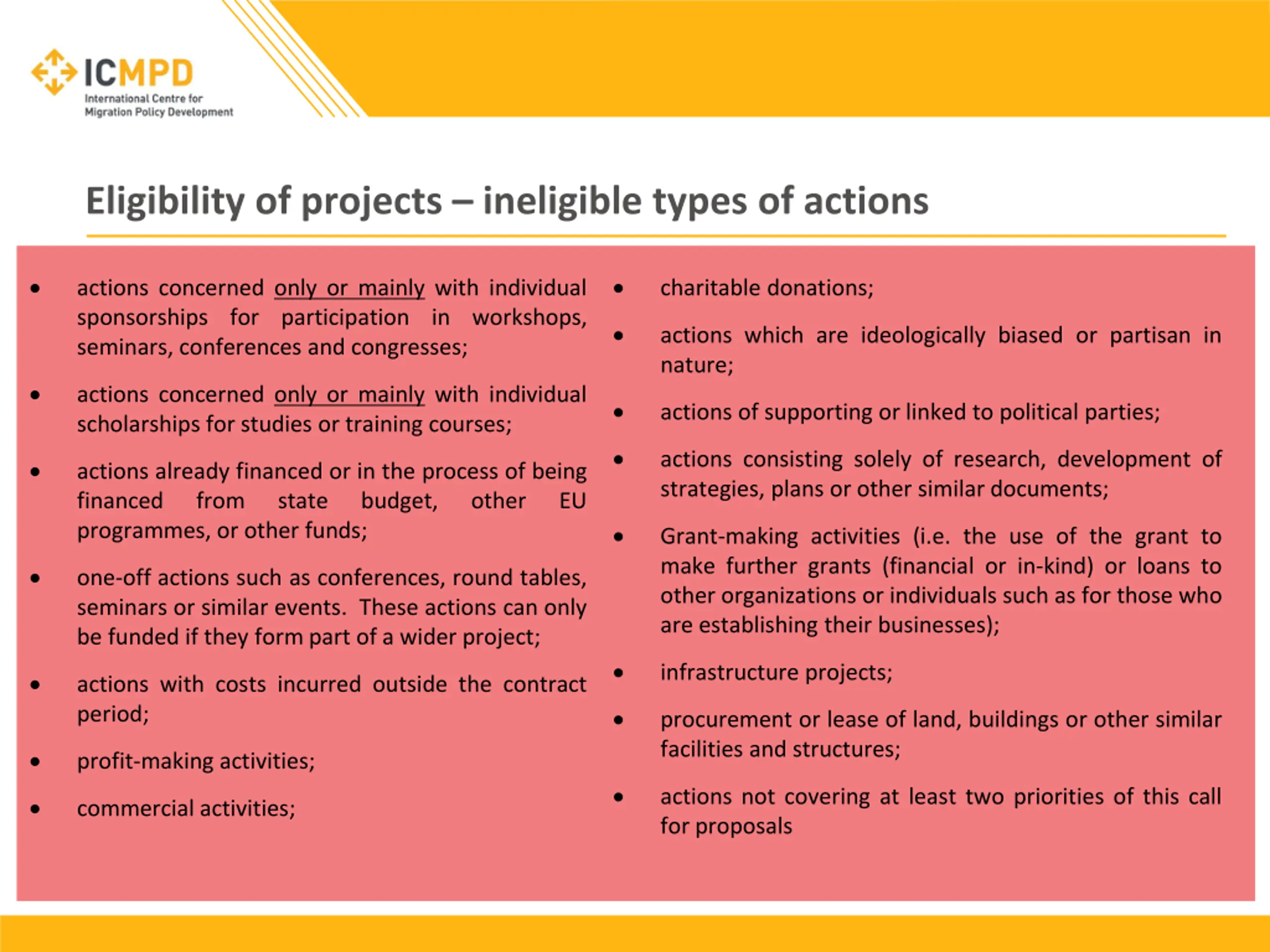 Eligibility of projects ineligible types of actions actions concerned only or mainly with individual sponsorships for participation in workshops, seminars, conferences and congresses; charitable donations; actions which are ideologically biased or partisan in nature; actions concerned only or mainly with individual scholarships for studies or training courses; actions of supporting or linked to political parties; actions consisting solely of research, development of strategies, plans or other similar documents; actions already financed or in the process of being financed from state programmes, or other funds; budget, other EU Grant-making activities (i.e. the use of the grant to make further grants (financial or in-kind) or loans to other organizations or individuals such as for those who are establishing their businesses); one-off actions such as conferences, round tables, seminars or similar events. These actions can only be funded if they form part of a wider project; infrastructure projects; actions with costs incurred outside the contract period; procurement or lease of land, buildings or other similar facilities and structures; profit-making activities; actions not covering at least two priorities of this call for proposals commercial activities;