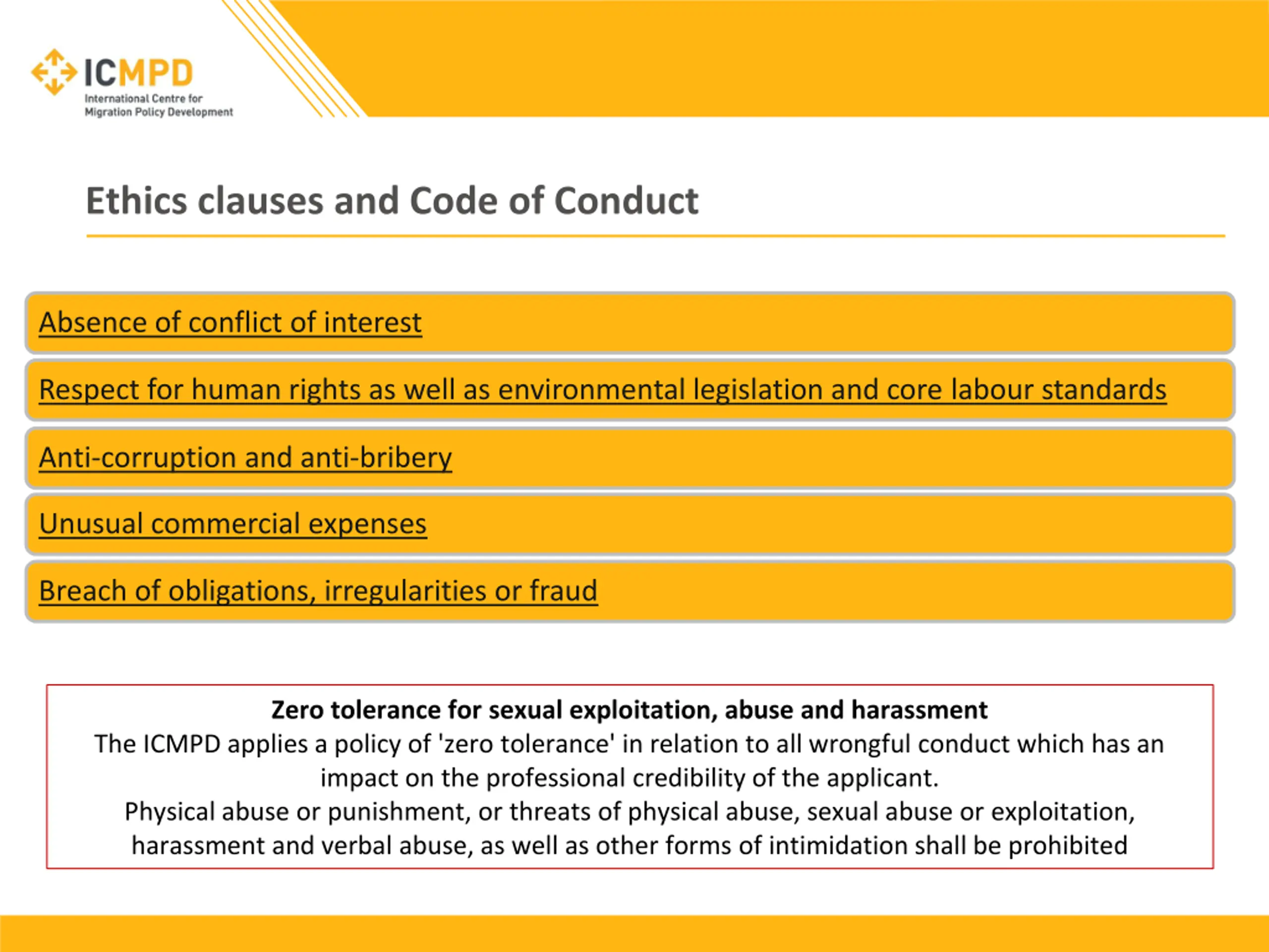 Ethics clauses and Code of Conduct Absence of conflict of interest Respect for human rights as well as environmental legislation and core labour standards Anti-corruption and anti-bribery Unusual commercial expenses Breach of obligations, irregularities or fraud Zero tolerance for sexual exploitation, abuse and harassment The ICMPD applies a policy of 'zero tolerance' in relation to all wrongful conduct which has an impact on the professional credibility of the applicant. Physical abuse or punishment, or threats of physical abuse, sexual abuse or exploitation, harassment and verbal abuse, as well as other forms of intimidation shall be prohibited